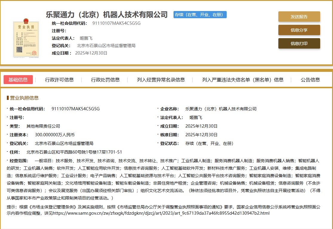 记者查询国家企业信用信息公示系统获悉,乐聚通力于2025年12月30日成立,注册资本300万元,登记机关为北京市石景山区市场监督管理局。该公司经营范围广泛,覆盖智能机器人的研发、工业机器人销售、软件开发及人工智能应用软件开发等关键领域。股权穿透信息显示,该公司由乐聚智能与关联方共同持股。