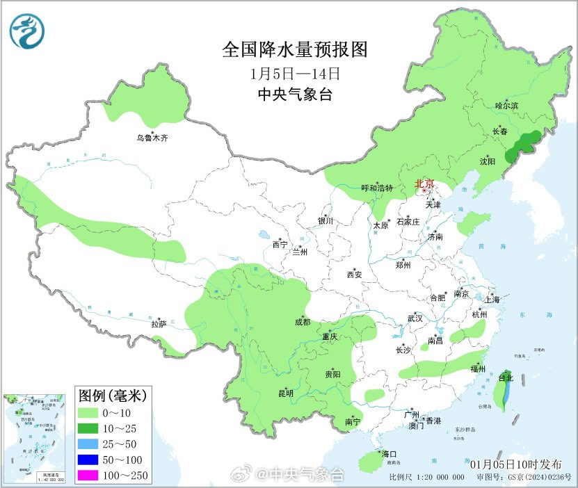 降水方面,全国大部分地区降水稀少,仅东北地区东部、台湾岛东部累计降水量有3~15毫米,台湾岛东部局地20毫米以上,较常年同期偏多或接近常年。