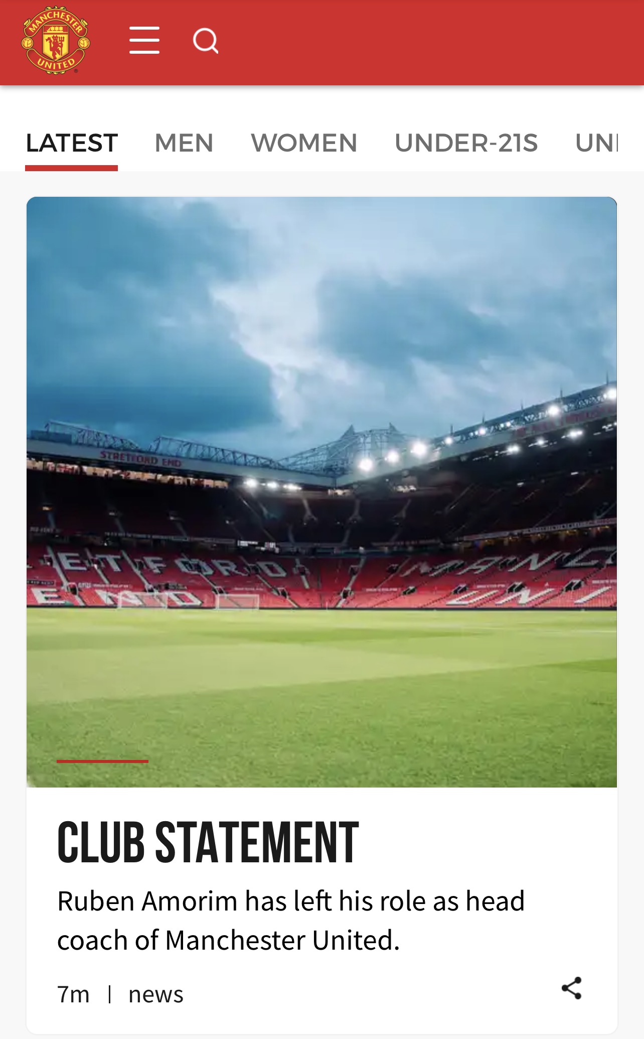 曼联俱乐部在公告中说,鉴于曼联目前在英超联赛中排名第六,俱乐部高层无奈之下决定做出改变,并认为这是恰当的时机。俱乐部感谢阿莫林为“红魔”做出的贡献,并祝愿他未来一切顺利。