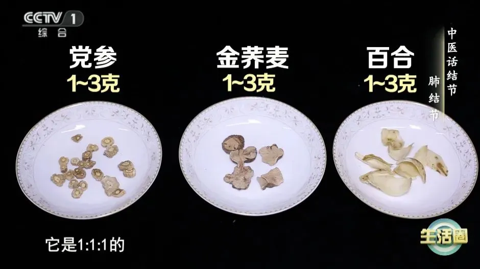 百合、党参、金荞麦,各取1~3克,用热水冲泡饮用,能够舒缓不良情绪、补肺气、散结,适合肺结节人群饮用,也可以用于预防肺结节发生。(小提示:脾胃功能异常,经常胃肠胀气的人群不宜饮用)