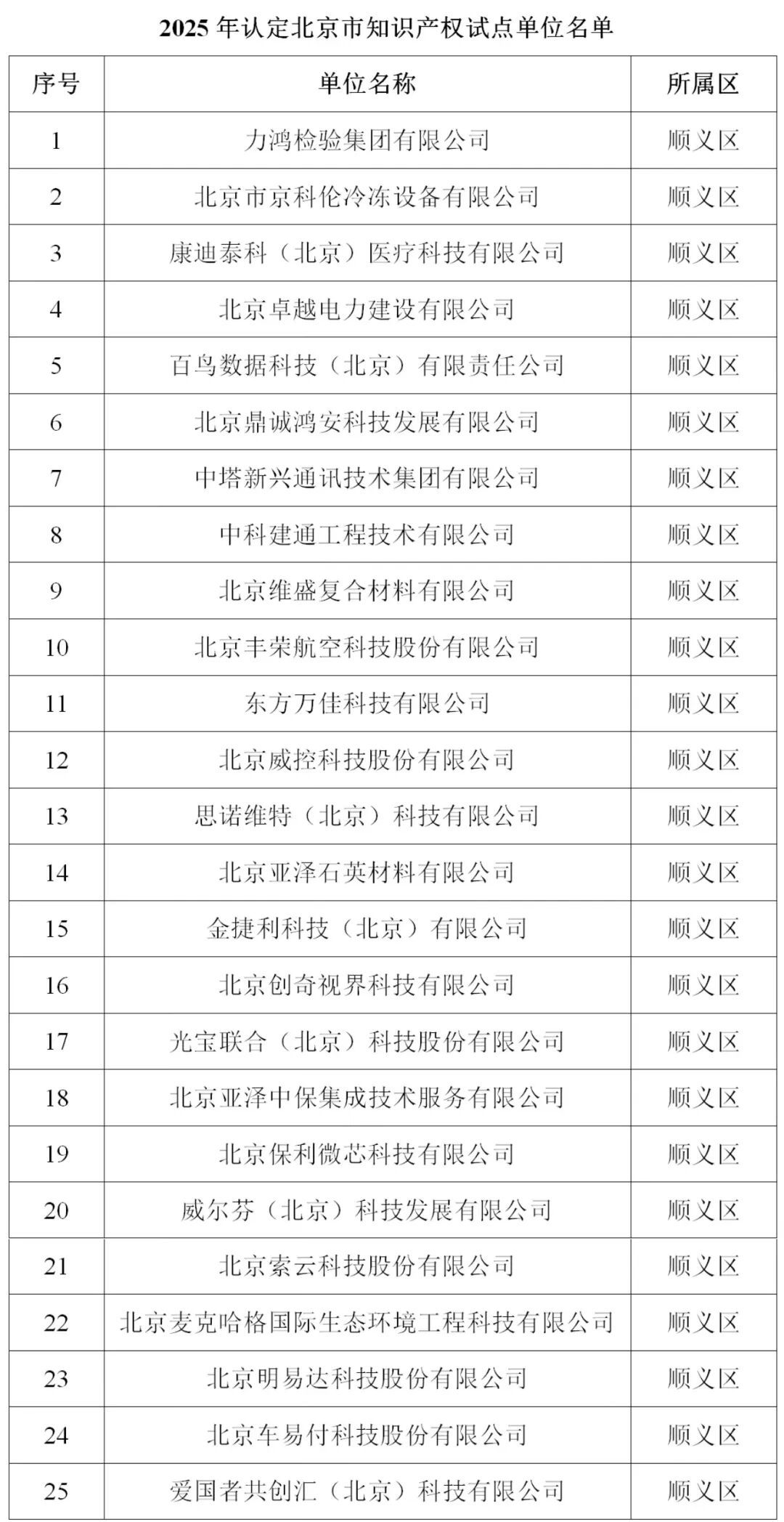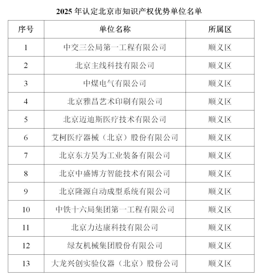 近日,北京市知识产权局公布了2025年认定北京市知识产权优势单位及知识产权试点单位名单。顺义区共有13家企业被认定为知识产权优势单位,25家企业被认定为知识产权试点单位。本次入选企业涵盖医疗健康、先进制造、工业技术等多个领域,标志着顺义区以知识产权为核心的产业创新生态日益完善。