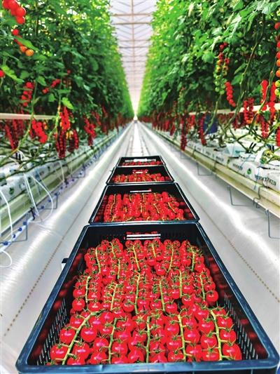 走进基地的玻璃温室,仿佛进入了一个充满科技感的未来农场。据技术人员介绍,这里通过物联网实时监测并自动调节温、光、水、气、肥,确保作物始终处于最佳生长环境。特别值得一提的是,基地创新地将供暖尾气中的二氧化碳回收利用,直接输送给温室里的番茄,既减少了排放,又为作物提供“气肥”,真正实现了“变废为宝”。