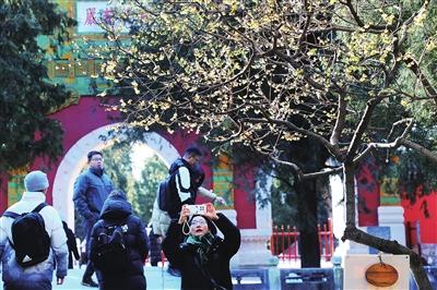 镜头里金黄的花朵与尚未落尽的绿叶相映成趣,“冬天能在户外闻到这么清透的香味,太治愈了,这是最好的新年礼物。”一旁的摄影爱好者李先生架着长焦镜头,耐心定格最美一刻。他说:“卧佛寺的蜡梅配古建,拍出来自带古风滤镜,每年都来打卡。”
