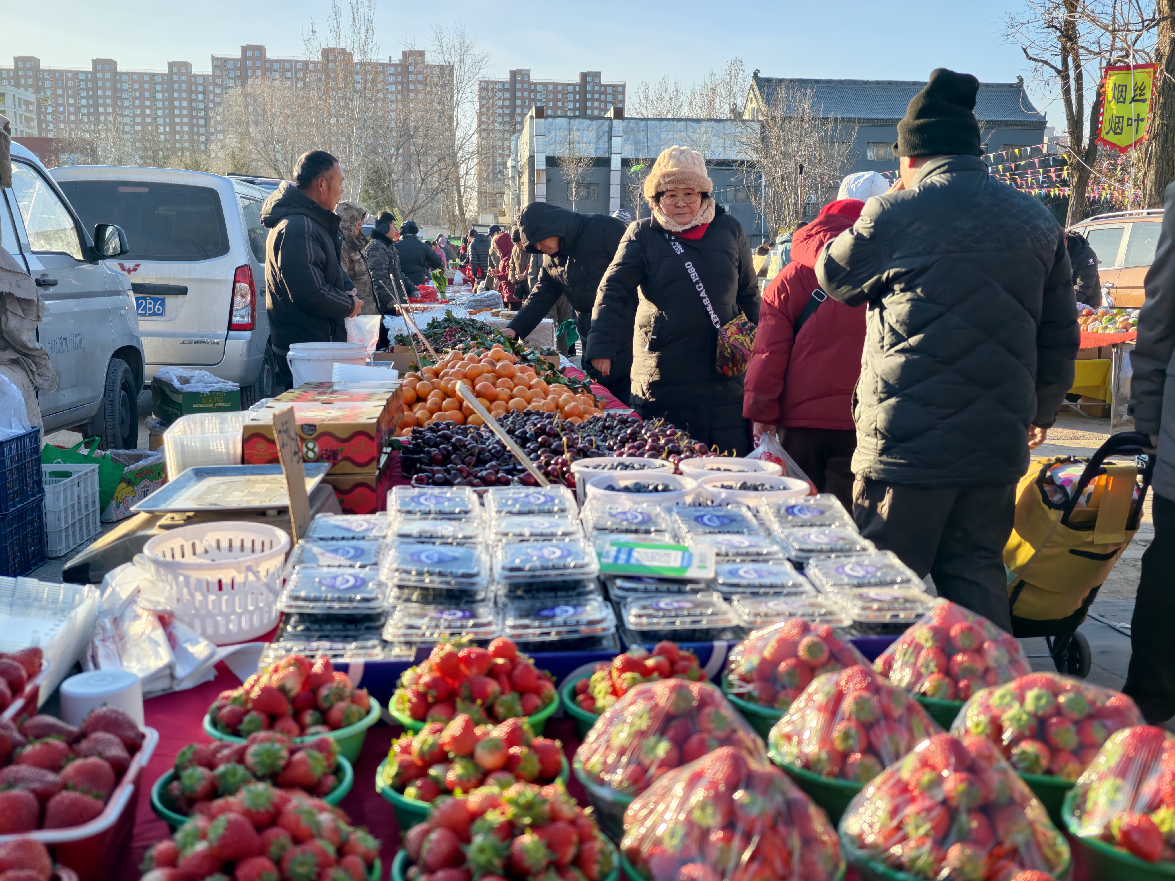 农产品摊位占市集八成以上,多数摊主都是像老陈这样的本地农户。减少了中间环节,价格自然实惠——菠菜1.5元一斤,萝卜0.8元一斤,草莓12元一盒。早起的市民推着小车穿梭其间,不到半小时,菜篮便满满当当。