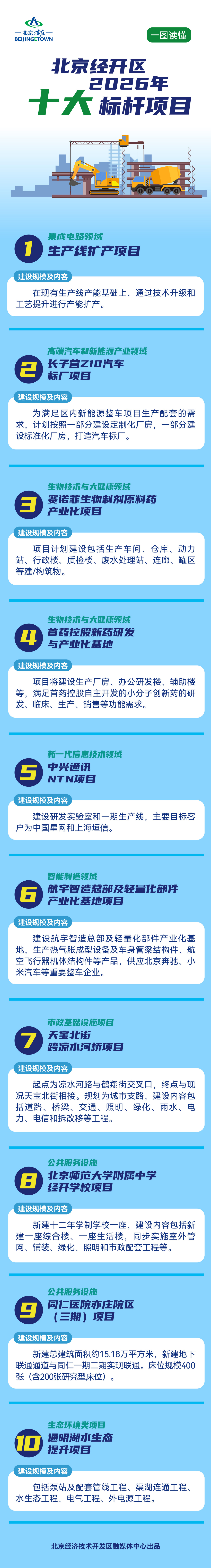 在公共服务设施领域,2026年,北京经开区将开工建设北京师范大学附属中学经开学校、同仁医院亦庄院区(三期)等项目,提升优质教育、医疗资源配置水平,提高居民的获得感和满足感。此外,2026年,经开区将围绕交通网络完善,开工建设天宝北街跨凉水河桥项目,提升区域通行效率;围绕生态环境优化,启动通明湖水生态提升项目,持续改善区域生态质量,提升宜业宜居水平。