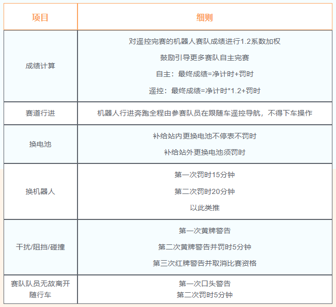 4.机器人通过起点线时开始计时,通过终点线时停表,机器人成绩为比赛计时与罚时总和。遥控方式参赛队的比赛净计时成绩须乘以系数1.2,作为有效参赛成绩即最终成绩=比赛净计时*1.2+罚时总和。奖项根据裁判委员会确认的成绩确定。