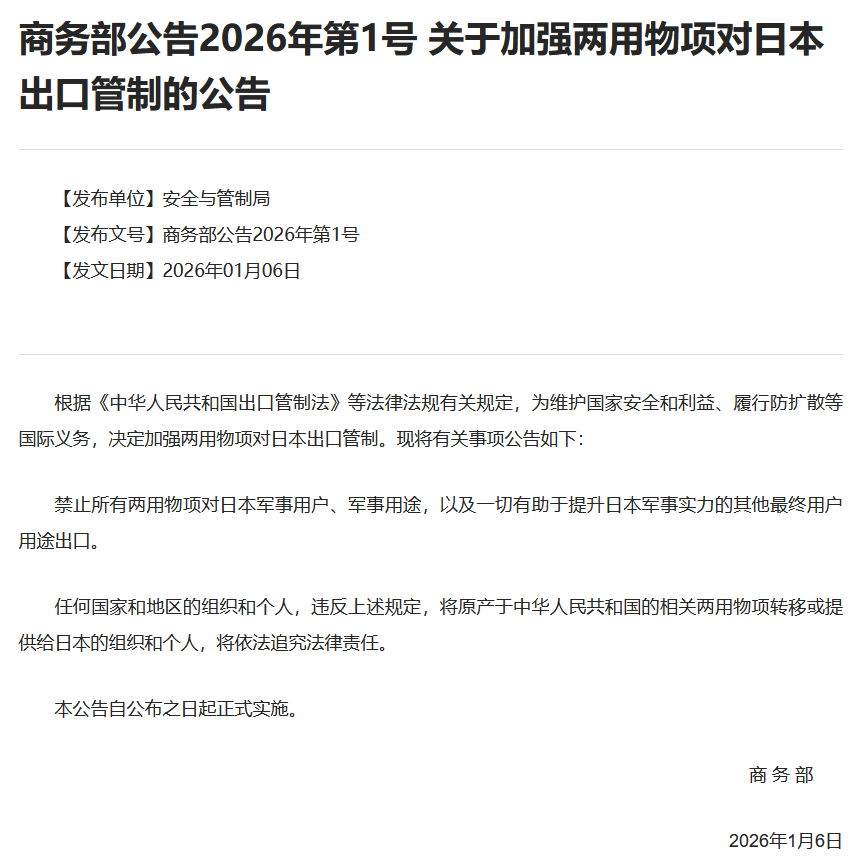 商务部公告2026年第1号关于加强两用物项对日本出口管制的公告