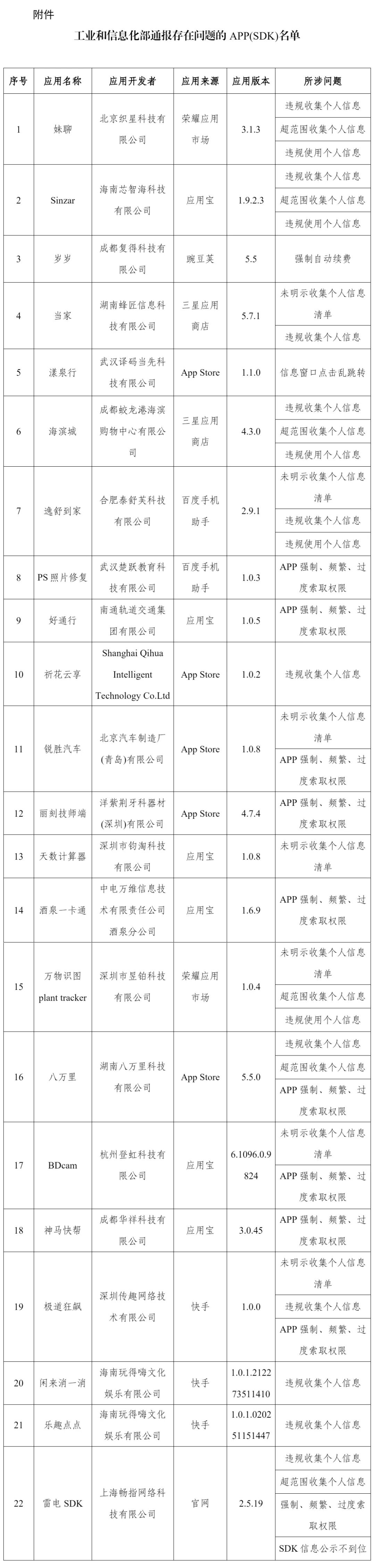 1月6日,工信部通过官方微信公众号“工信微报”发布通报,称在近期组织第三方检测机构进行抽查,共发现22款APP(应用程序)及SDK(软件开发工具包)存在侵害用户权益行为。