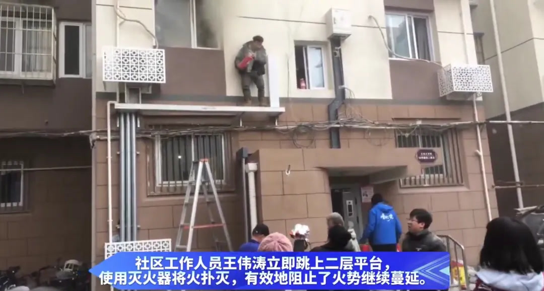 与此同时,物业经理周涛带领员工在楼道内增援,通过楼道窗户,给王伟涛递灭火器。该单元居民张立新发现火情后,也主动加入到了灭火行列。不多久,起火住户的户主来到楼下,物业工作人员李伟建拿着户主的钥匙来到2层打开房门,进入室内用灭火器灭火。