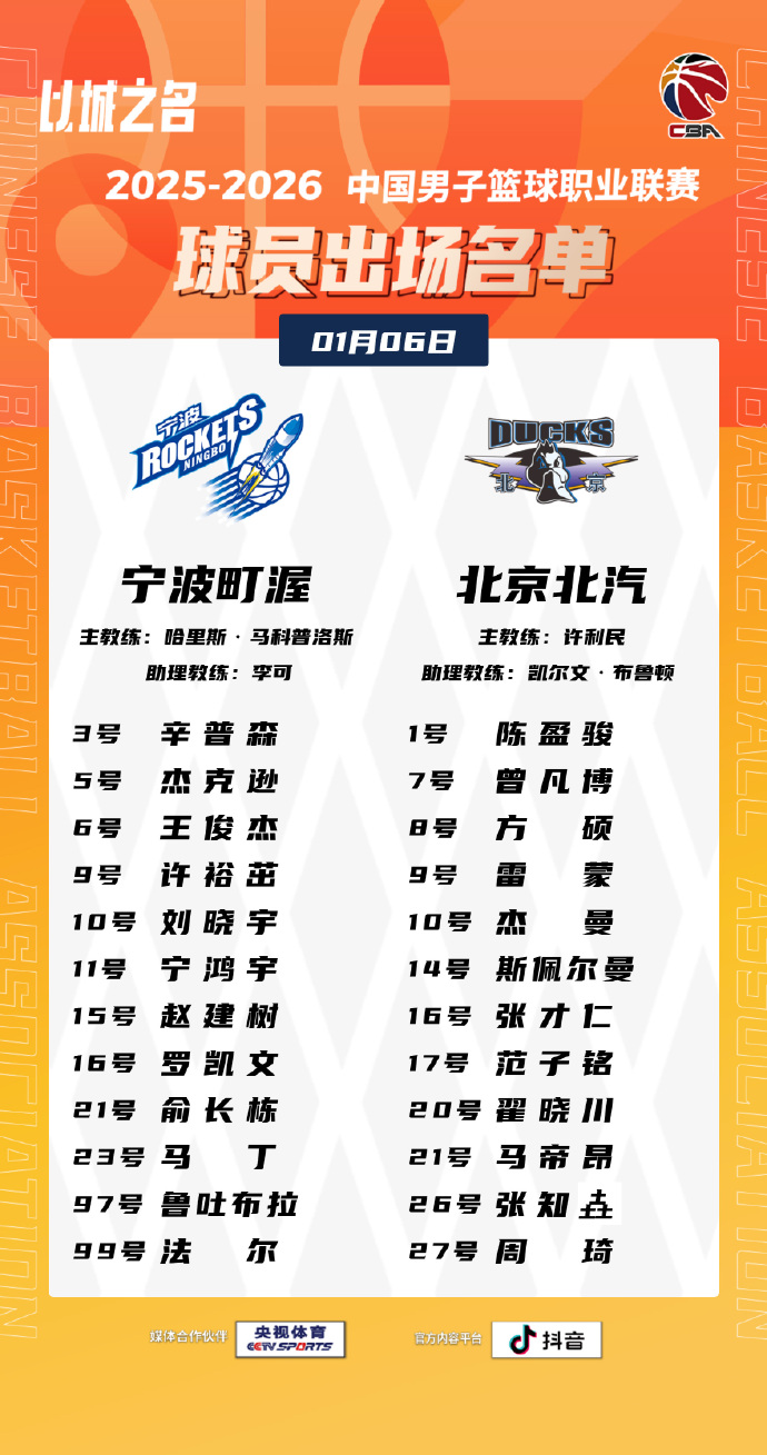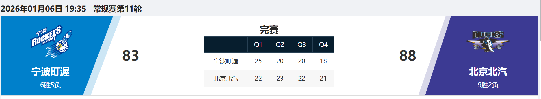 1月6日,在CBA常规赛第11轮比赛中,北京北汽队在客场以88比83战胜宁波队。北汽队打得磕磕绊绊,好在赢下了胜利。