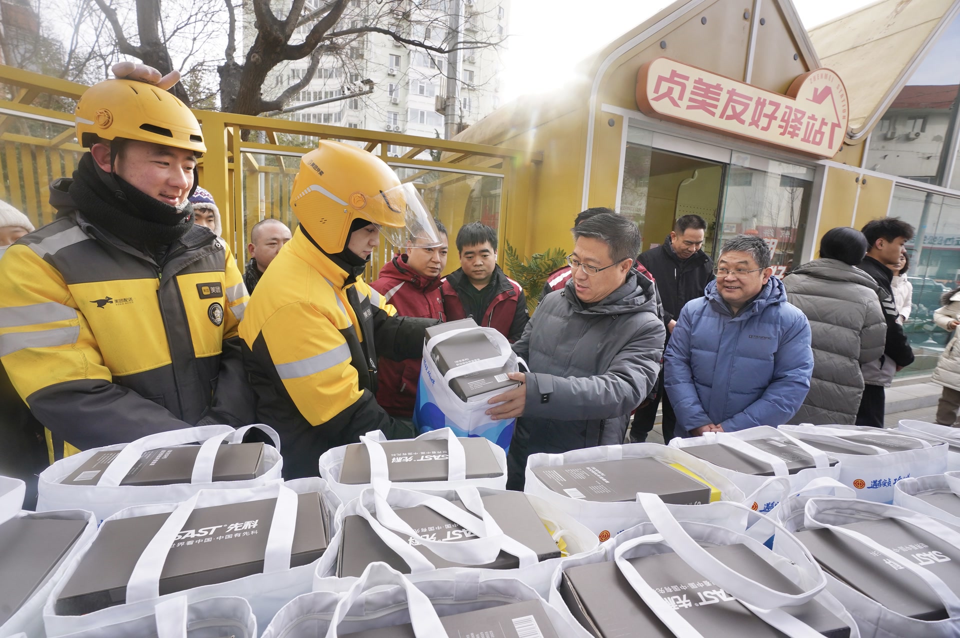 1月7日上午,安贞街道向快递员、外卖配送员、文明引导员、环卫工人、保安等户外劳动工作者代表发放了暖心礼包。