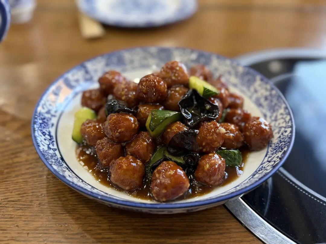 不一会儿,一盘焦溜丸子端上桌。酸甜的酱汁均匀裹着金黄的丸子,搭配着清爽的黄瓜片、黑木耳,香气瞬间飘满整个屋子。夹起一个咬开,酥脆的外皮应声裂开,内里的肉馅紧实弹牙,酸甜酱汁不齁不淡,刚好解腻。