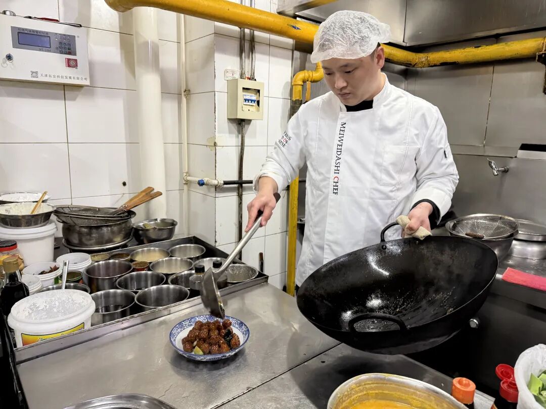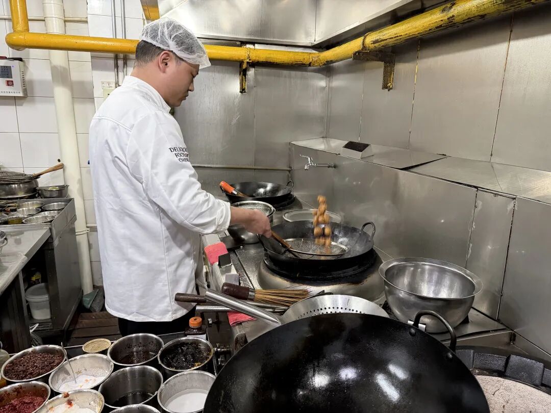 炸丸子的锅灶旁,厨师紧紧盯着油温,手里的漏勺不停翻动,丸子在油锅里翻滚着,渐渐染上诱人的金黄。“得现点现炸,上桌前还得复炸一遍。”黄宝明指着刚捞出来的丸子,外皮还冒着滋滋的热气,“你听,咬下去‘咯吱’一声,这才叫外焦里嫩。要是炸完放凉了,皮软了,味儿就差远了。”