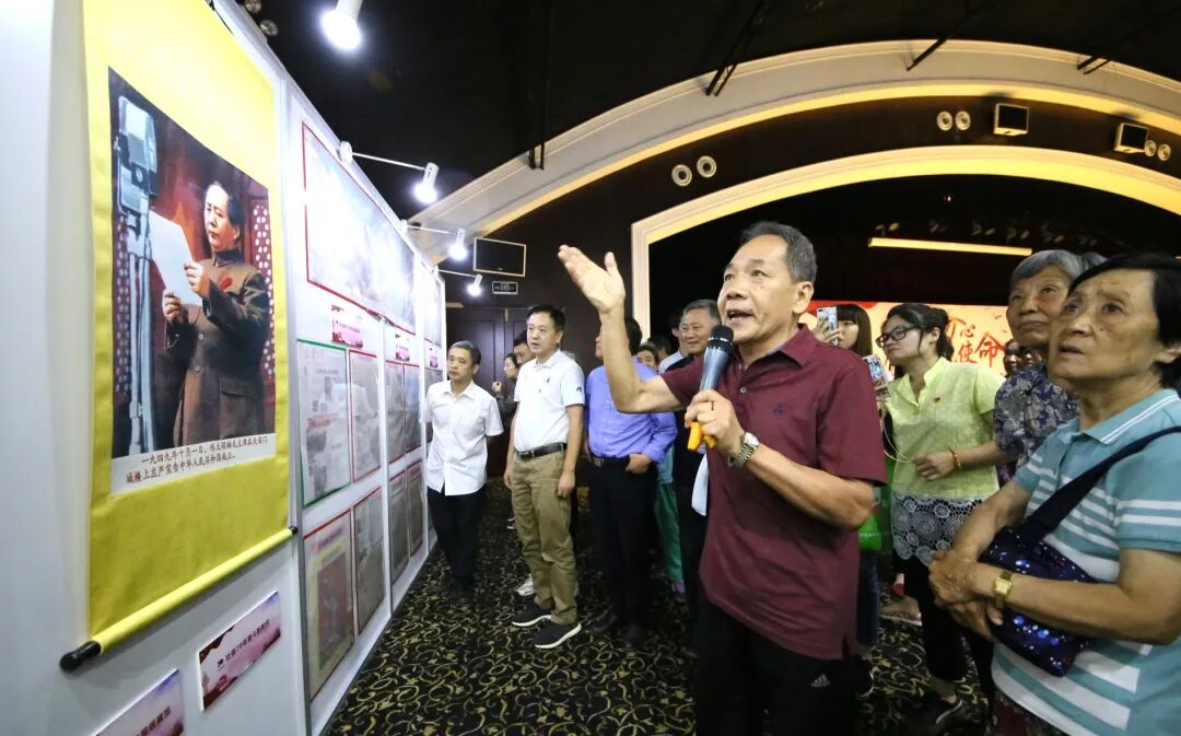 △2019年9月27日,李铁光在体育馆路街道“庆祝新中国成立70周年”报展现场讲解自己收藏的报纸。