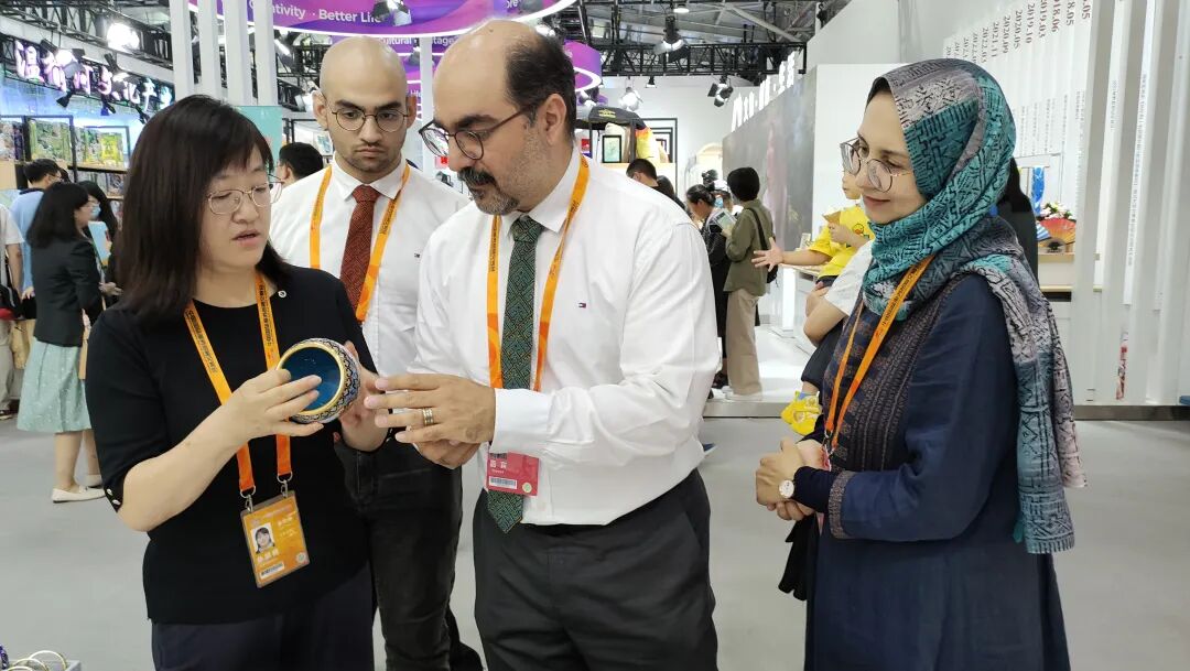 △中国国际服务贸易交易会期间,董艳娜向顾客介绍景泰蓝产品。