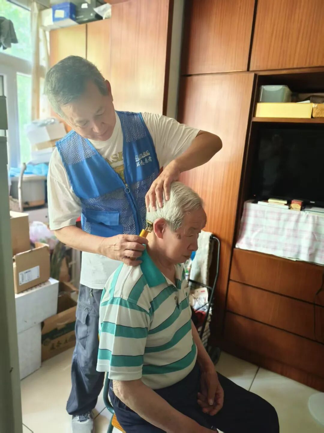 △夏军给父亲理发。