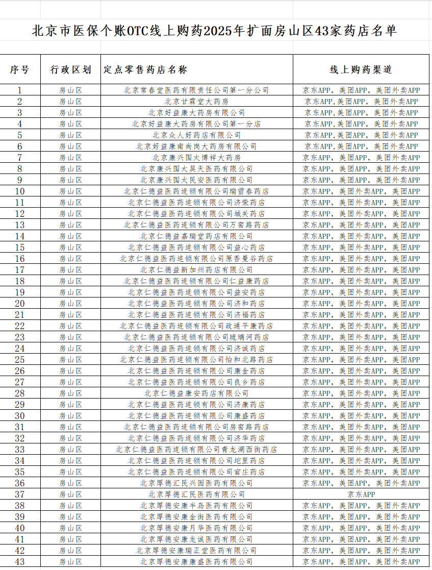 截至2026年1月1日,43家新增药店已全部通过房山区医保局验收,并在市医保局统一部署下向公众正式上线,房山区线上医保购药定点药店规模显著扩大。