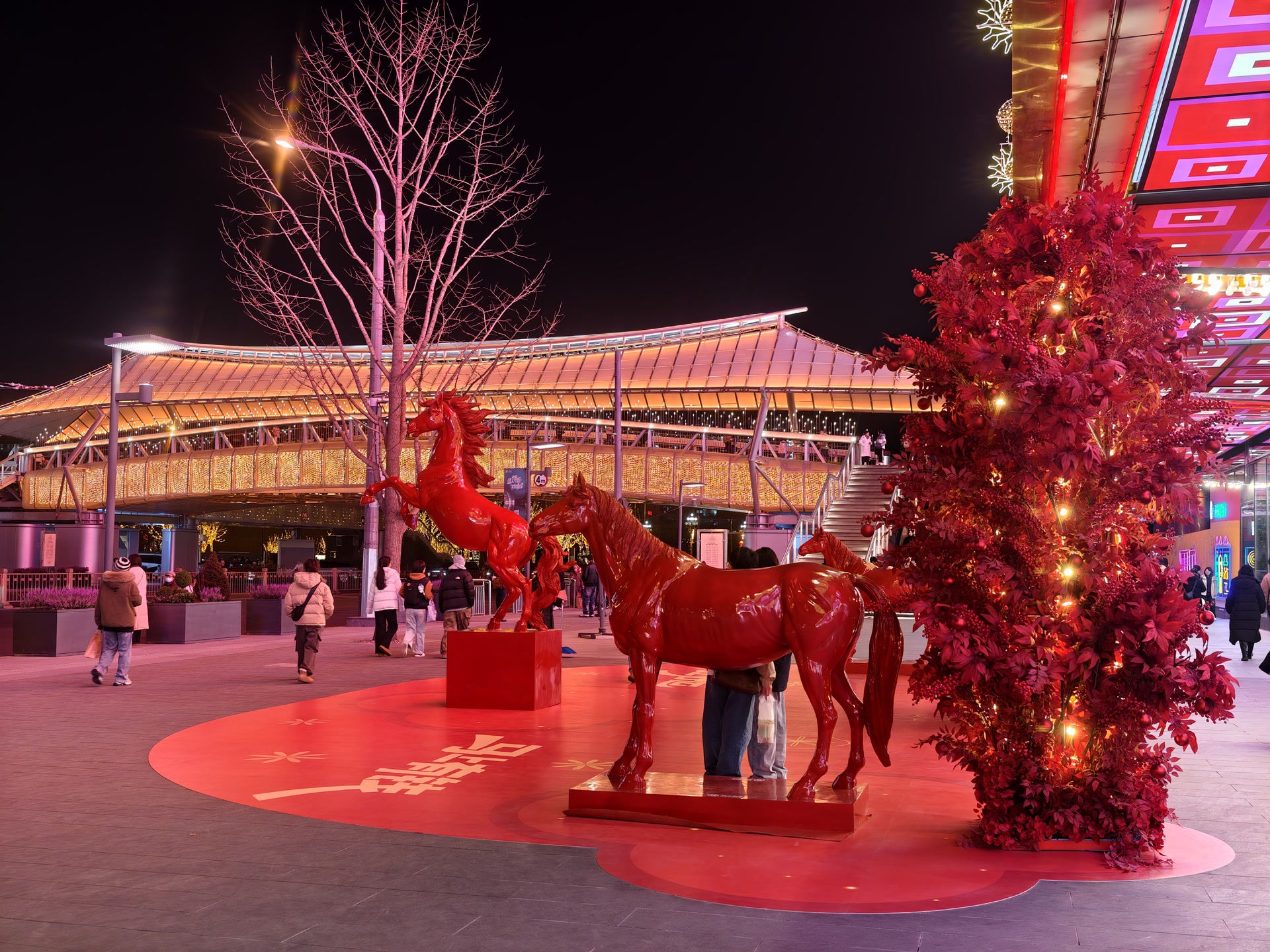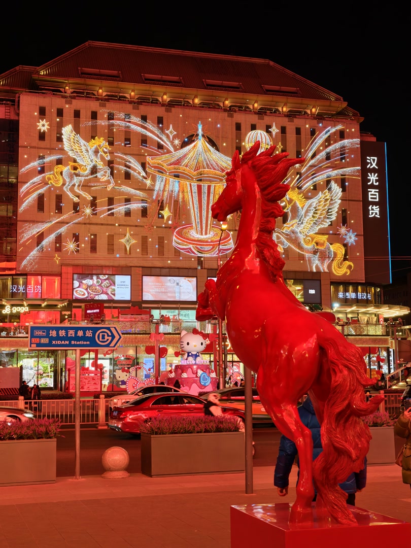 元旦已过,春节将至,北京各大商圈的布置越来越迎合着过年的气氛。在西单商圈,红色骏马雕塑、旋转木马彩灯逐一亮相,将节庆氛围烘托得愈发浓厚。