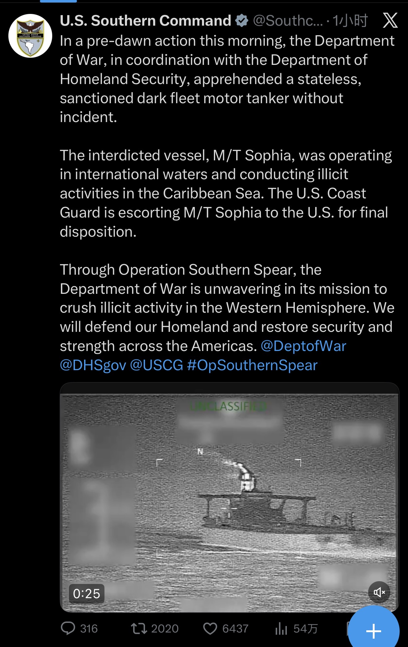 此外,美国南方司令部7日在社交媒体发布消息称,美国当天凌晨拦截“一艘无国籍、受制裁的‘影子舰队’油轮”,行动过程中未发生任何意外。该船名为“索菲亚”号,当时正在国际水域航行。美国海岸警卫队正在控制“索菲亚”号前往美国进行处置。据路透社消息,这艘船1月早些时候从委内瑞拉驶离。