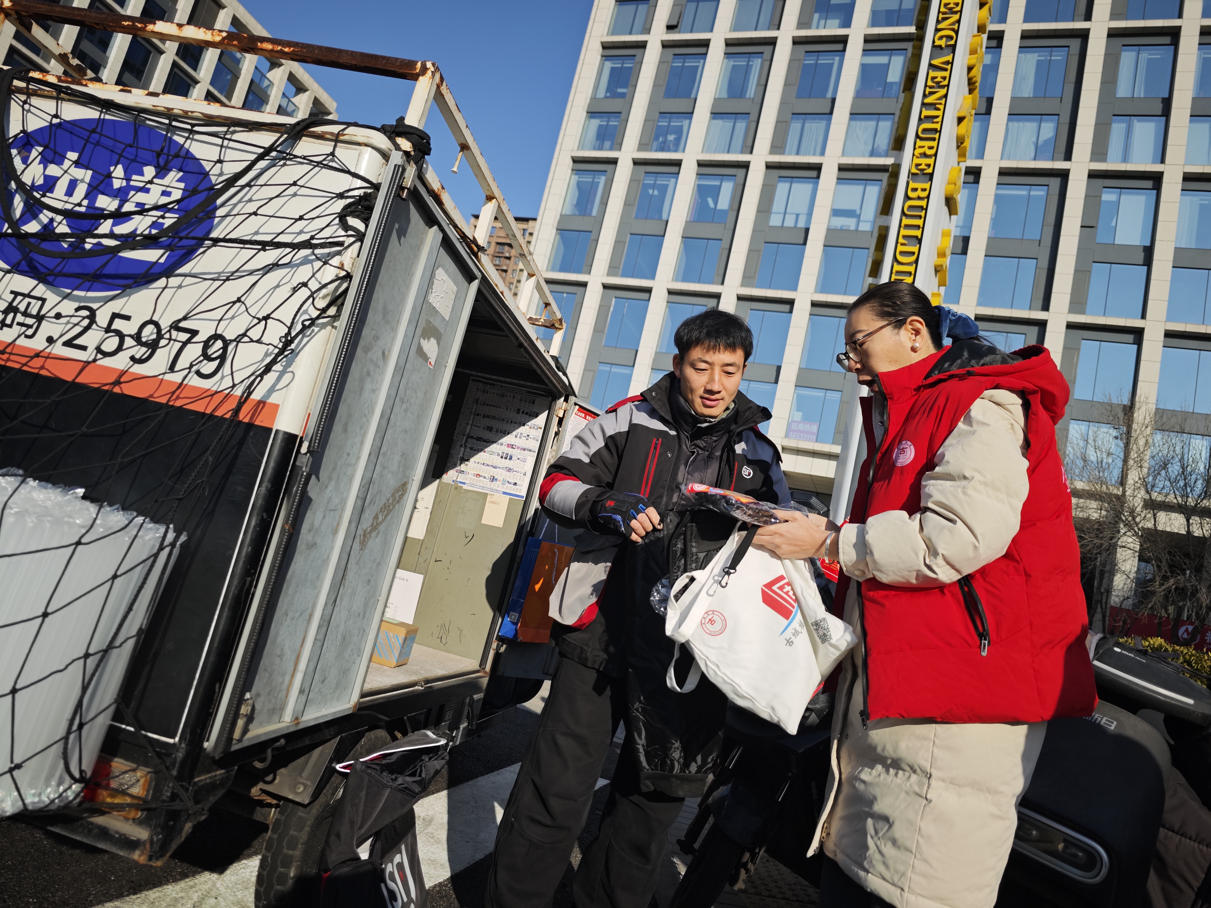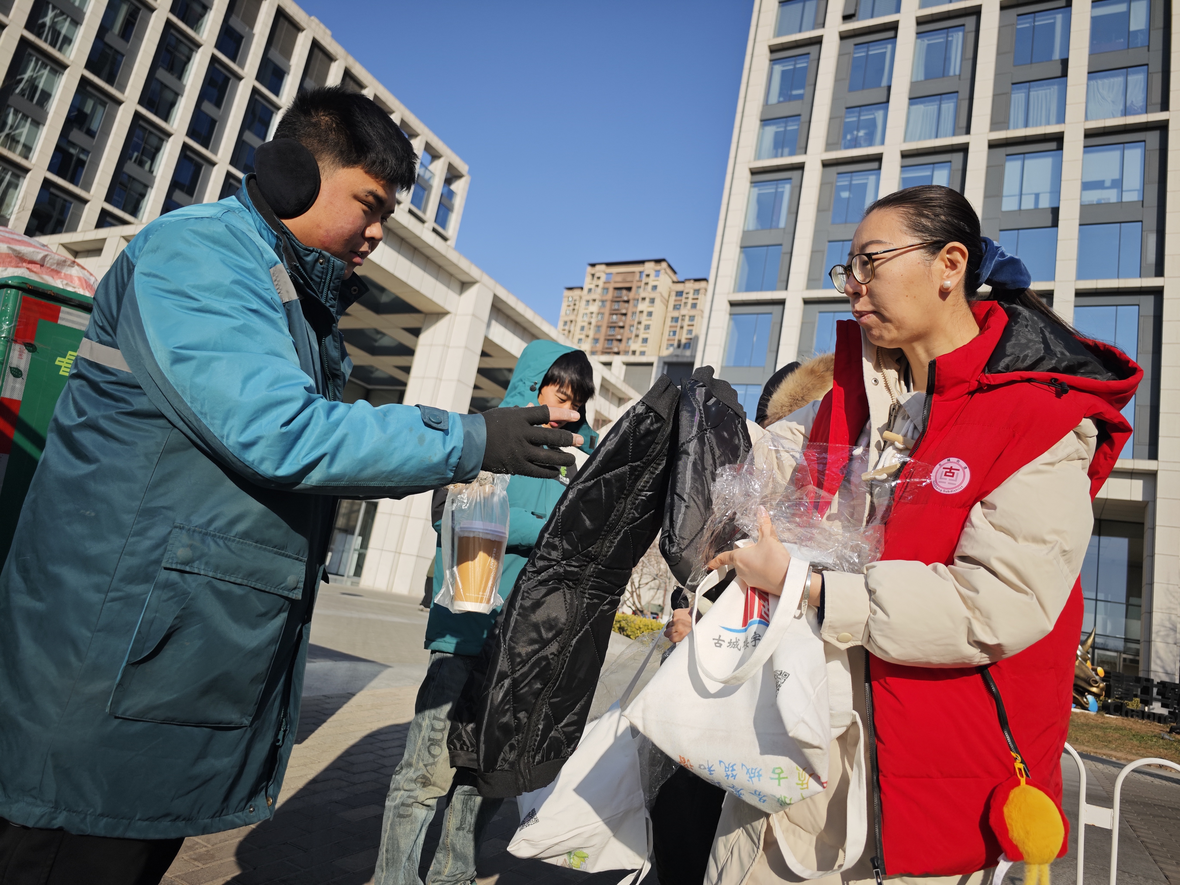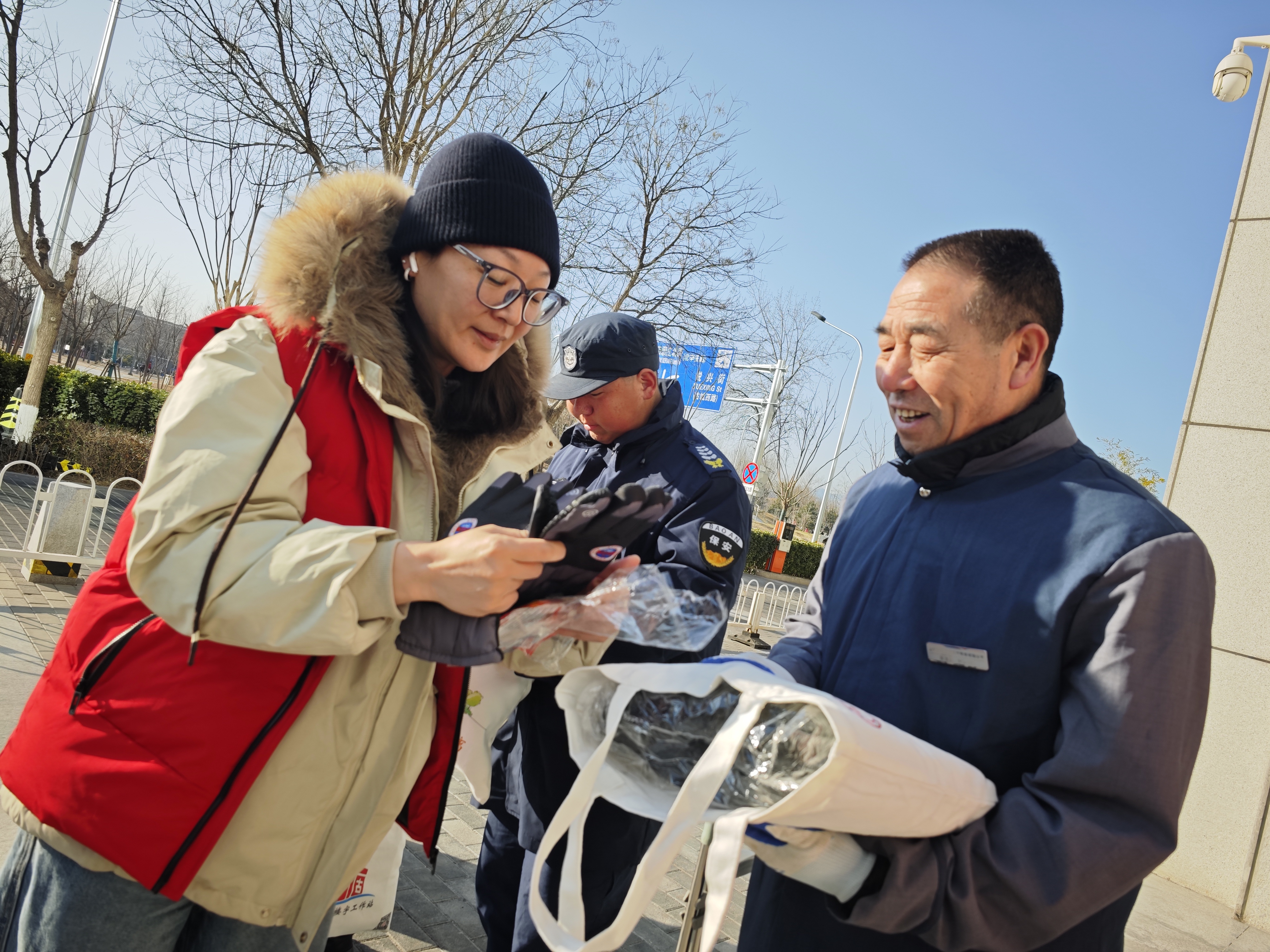 早上,古城创业大厦楼宇工作站的工作人员早早备好了暖宝宝、厚围巾、防寒手套等御寒物品,陆续分发到大厦及周边的保安、保洁、快递小哥等户外劳动者手中。