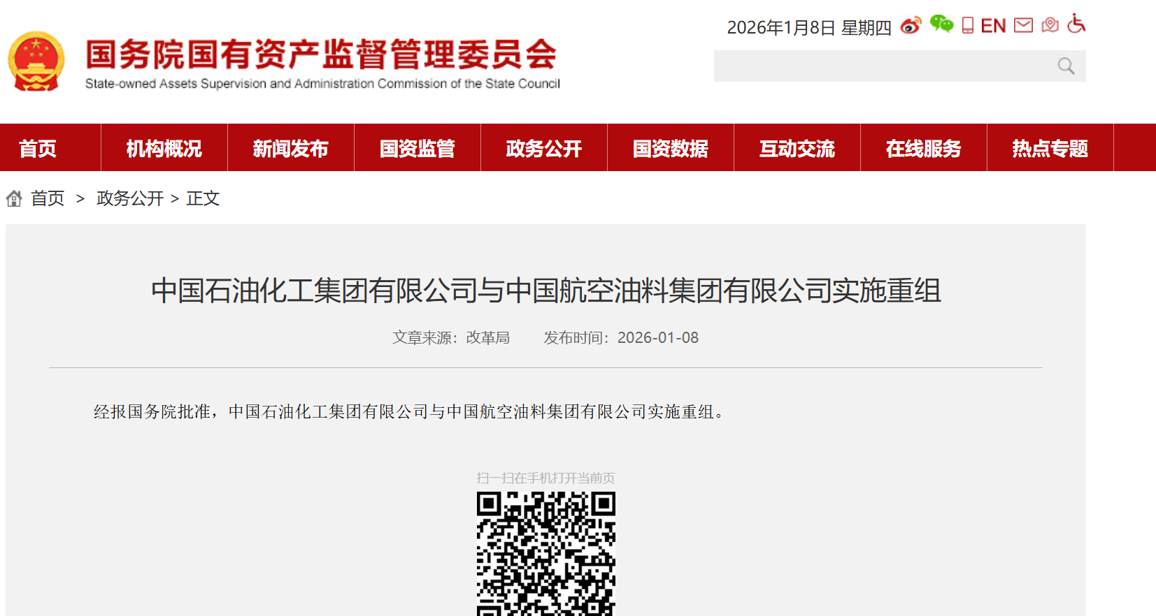 今年首例央企重组来了。1月8日,国务院国资委官网发布消息,经报国务院批准,中国石油化工集团有限公司与中国航空油料集团有限公司实施重组。在央企名录里,两家央企的序号分别为第12和第88。