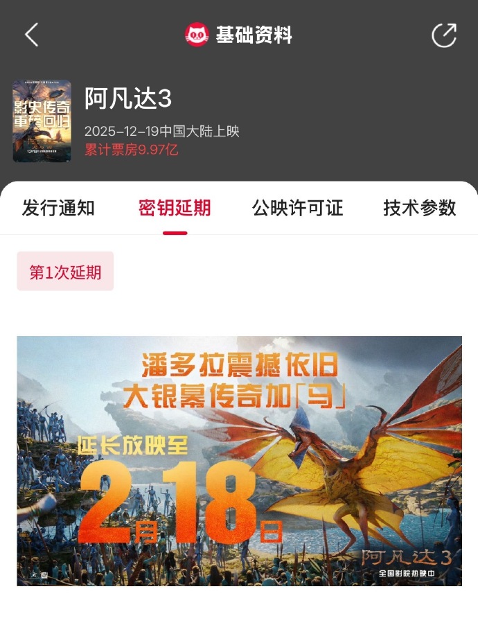 电影《阿凡达3》宣布密钥延期,延长上映至2026年2月18日,据猫眼专业版数据,截至当前影片累计票房已超9.97亿。