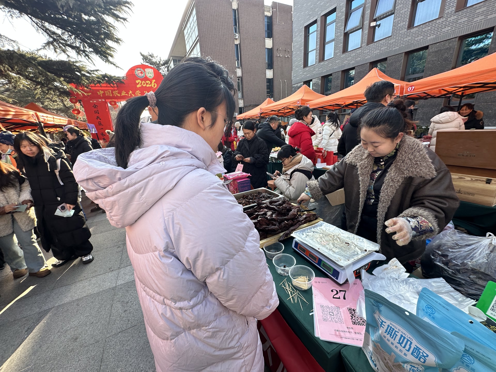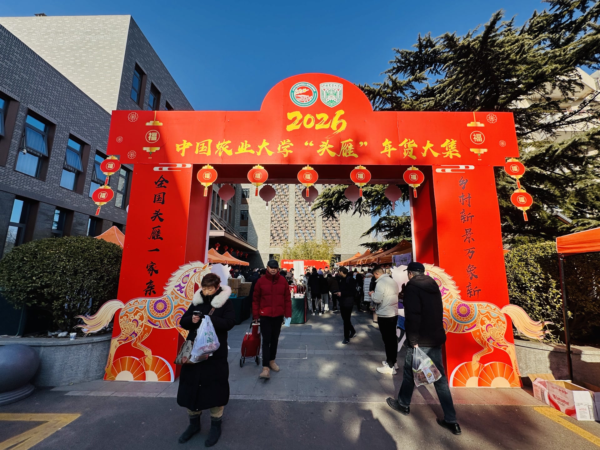 “大学校园里也能赶大集?走,逛逛去!”1月8日,2026年中国农业大学“头雁”年货大集在农大西校区热闹开市。来自20个省份的500余种特色农产品,从原产地的田间地头新鲜直达校区,吸引市民学生前来淘货。