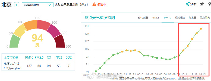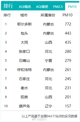 受冷空气影响,今天内蒙古、宁夏、陕西、山西等地出现大风天气。在大风影响下,内蒙古中西部、陕西北部、山西北部等地出现沙尘,PM10明显超标,内蒙古乌海、鄂尔多斯、陕西榆林14时空气质量“爆表”。