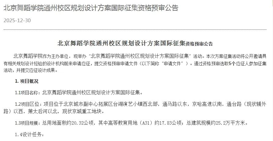 1月6日,通州区第七届人民代表大会第七次会议召开。作为未来的首都“文化新地标”,北京舞蹈学院通州校区建设备受关注,已被明确列为通州区2026年的重点工作之一。
