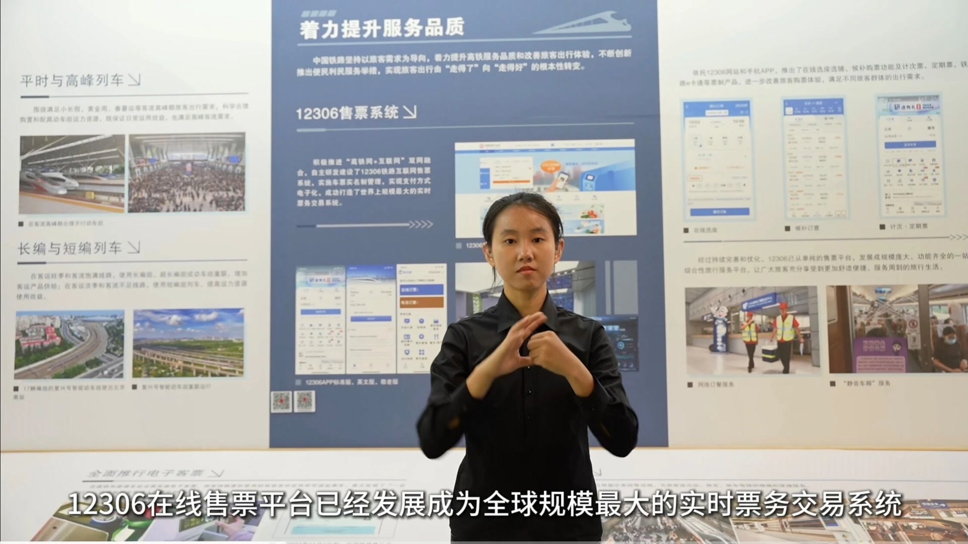 “欢迎您来到中国高铁展厅……”点开手语导览,便可跳转到视频。视频中,手语导览人员穿梭在展览各处,将中国高铁的发展历程“翻译”成手语,并向观众一一展示出来。