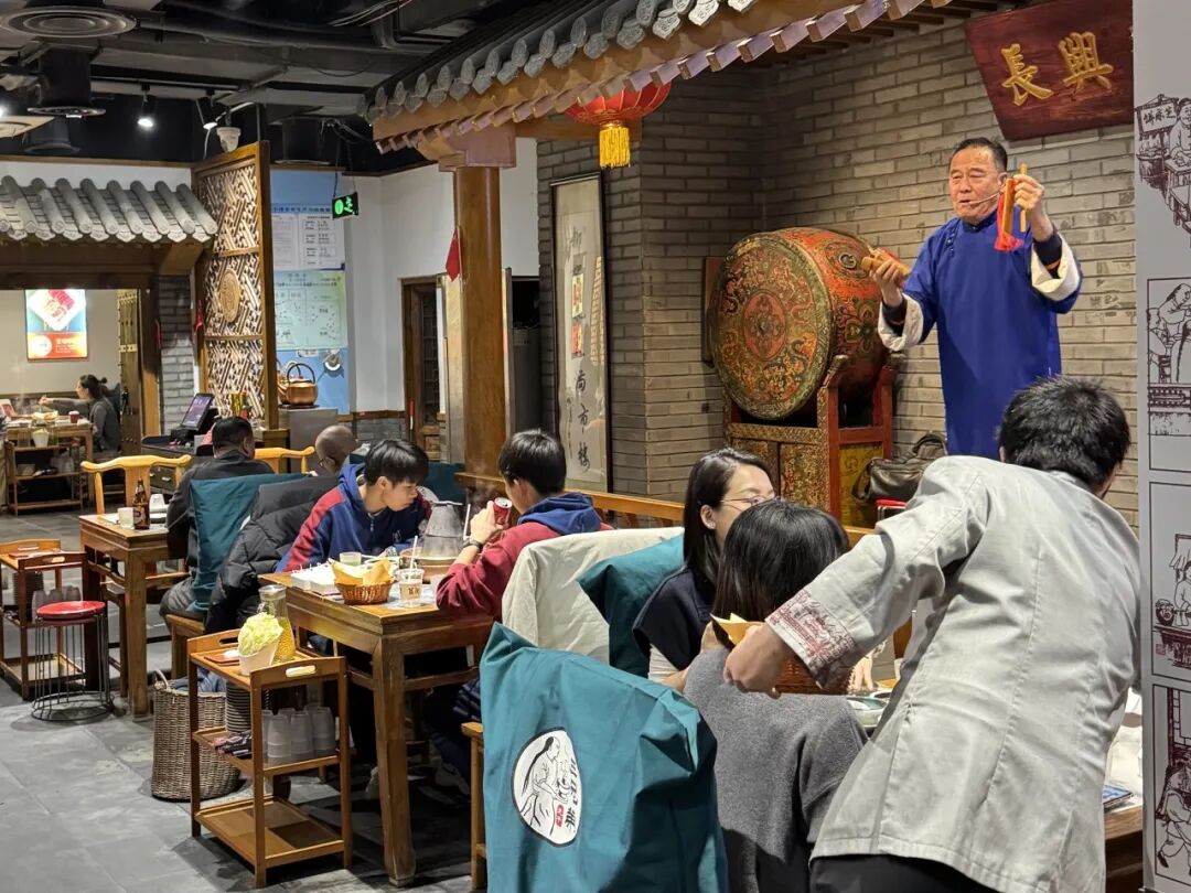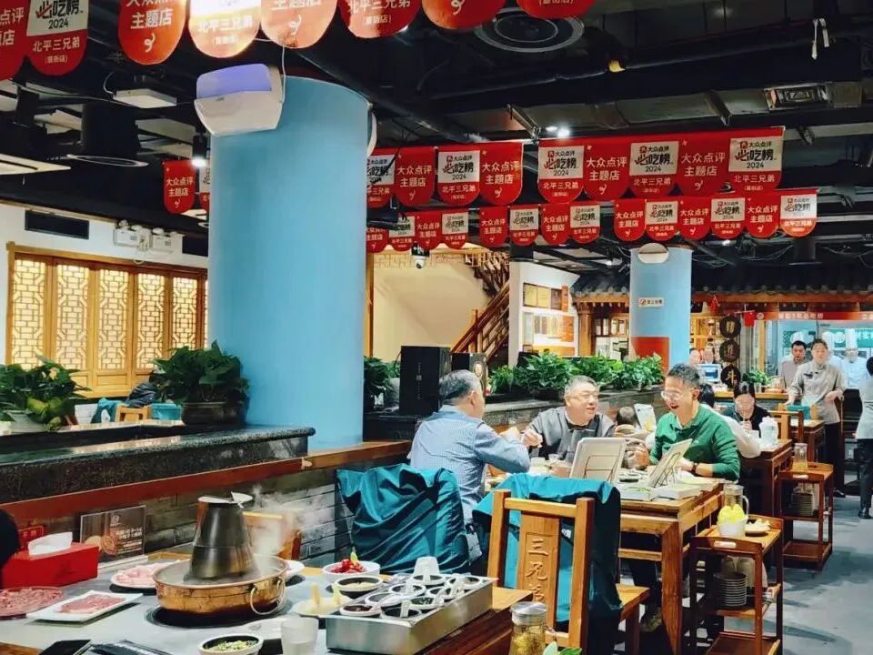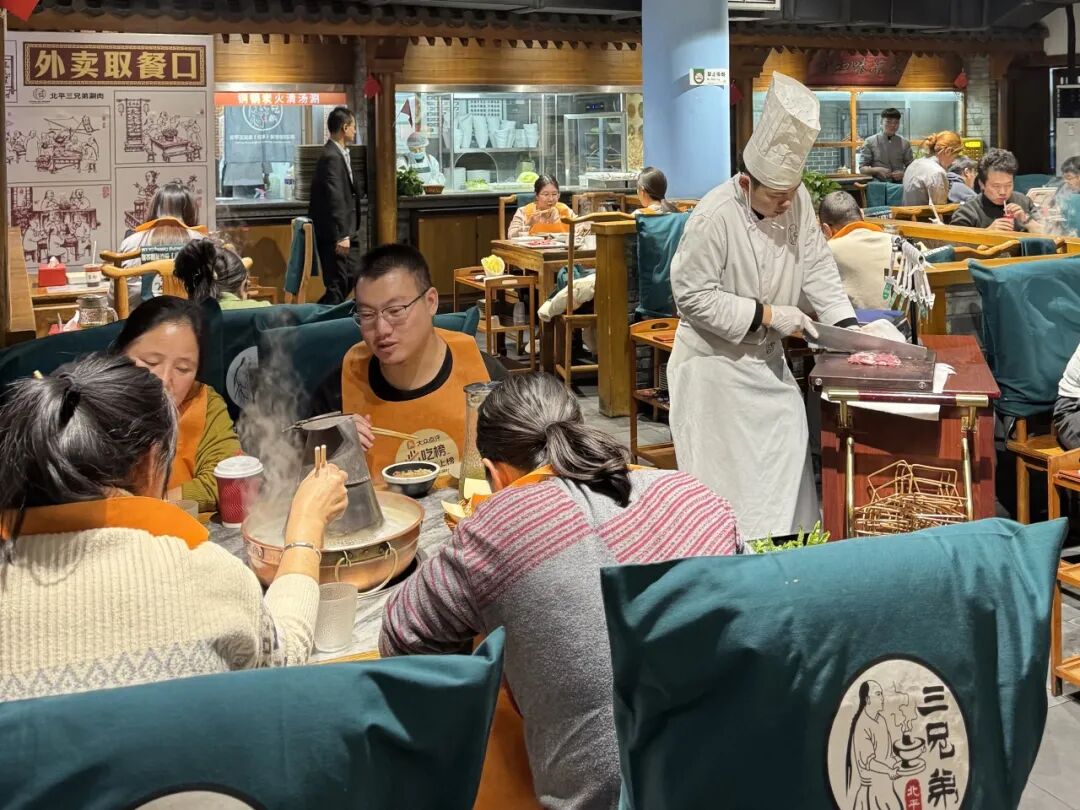 走进店内,热气氤氲中,传统铜锅炭火咕嘟作响,招牌菜“堂切半边云”尤为抢眼,这款半肥瘦相间的鲜羊肉坚持当日现切,在炭火中涮煮片刻便鲜嫩入味,一直是食客的心头好。食客们举箸畅谈,欢声笑语与锅底沸腾声交织在一起,周末及节假日的晚餐时段,店内还会安排快板等特色民俗演出,让食客在品味美食的同时,感受老北京的文化韵味。“店铺营业时间一直延续到凌晨3点,凌晨3点前进门的顾客都能正常用餐,许多游客吃完后便直奔天安门广场等待升旗,成为夜间消费与城市文旅的巧妙衔接。”北平三兄弟涮肉相关负责人说道。