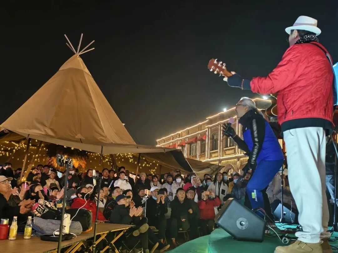 傍晚时分,广和广场上的音乐演出准时开启,歌手清澈的嗓音伴着美食香气,吸引市民游客驻足。游客刘阿姨说:“没想到冬天的傍晚还能这样热闹,露营帐篷里有暖气,一点都不冷,边听音乐边吃美食,太舒服了。”