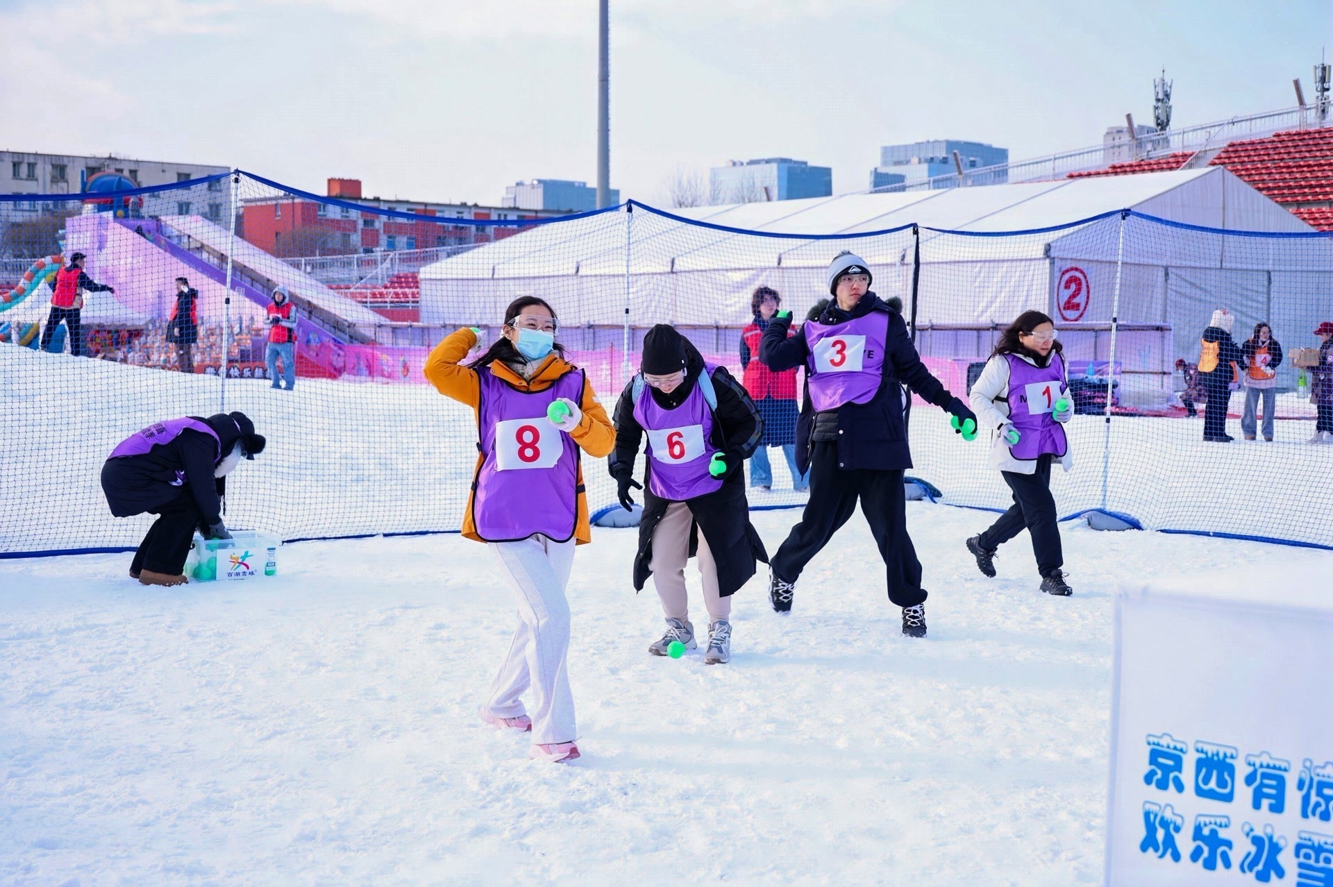 表演结束后,备受期待的雪球大战正式开始。比赛采用淘汰制,每局2分钟,每队10名队员,使用特制“雪球”,借助场地上的掩体进行激烈“对战”。传球、瞄准、投掷……“雪球”在空中划出一道道弧线,场上欢呼声、呐喊声此起彼伏,令选手们重温了童年打雪仗的纯粹快乐。