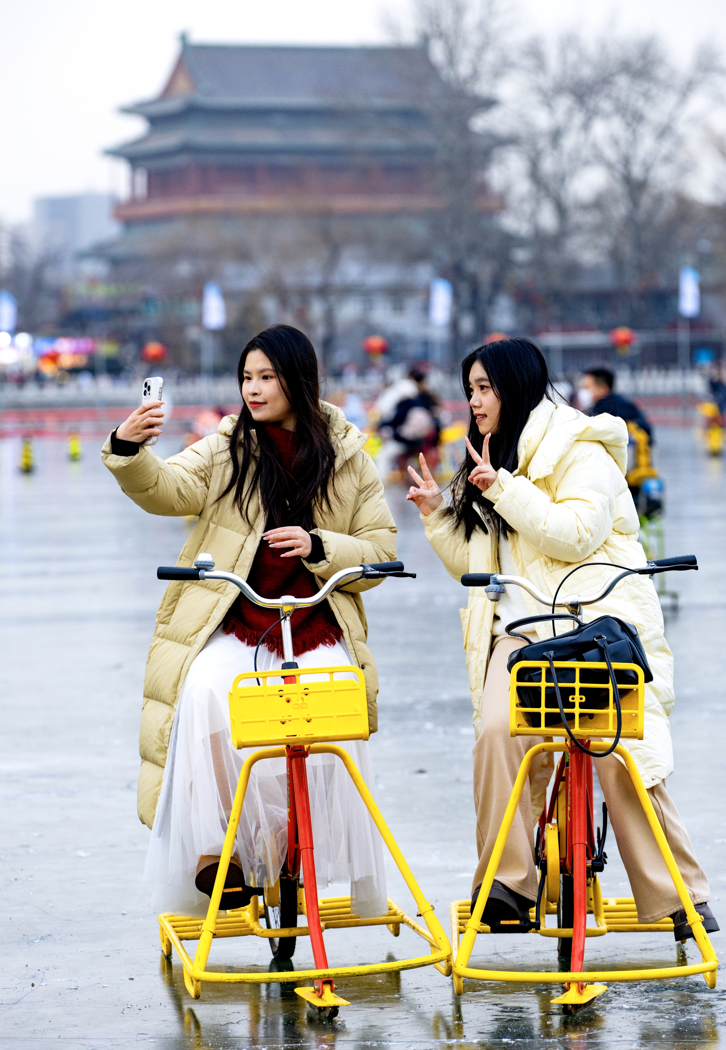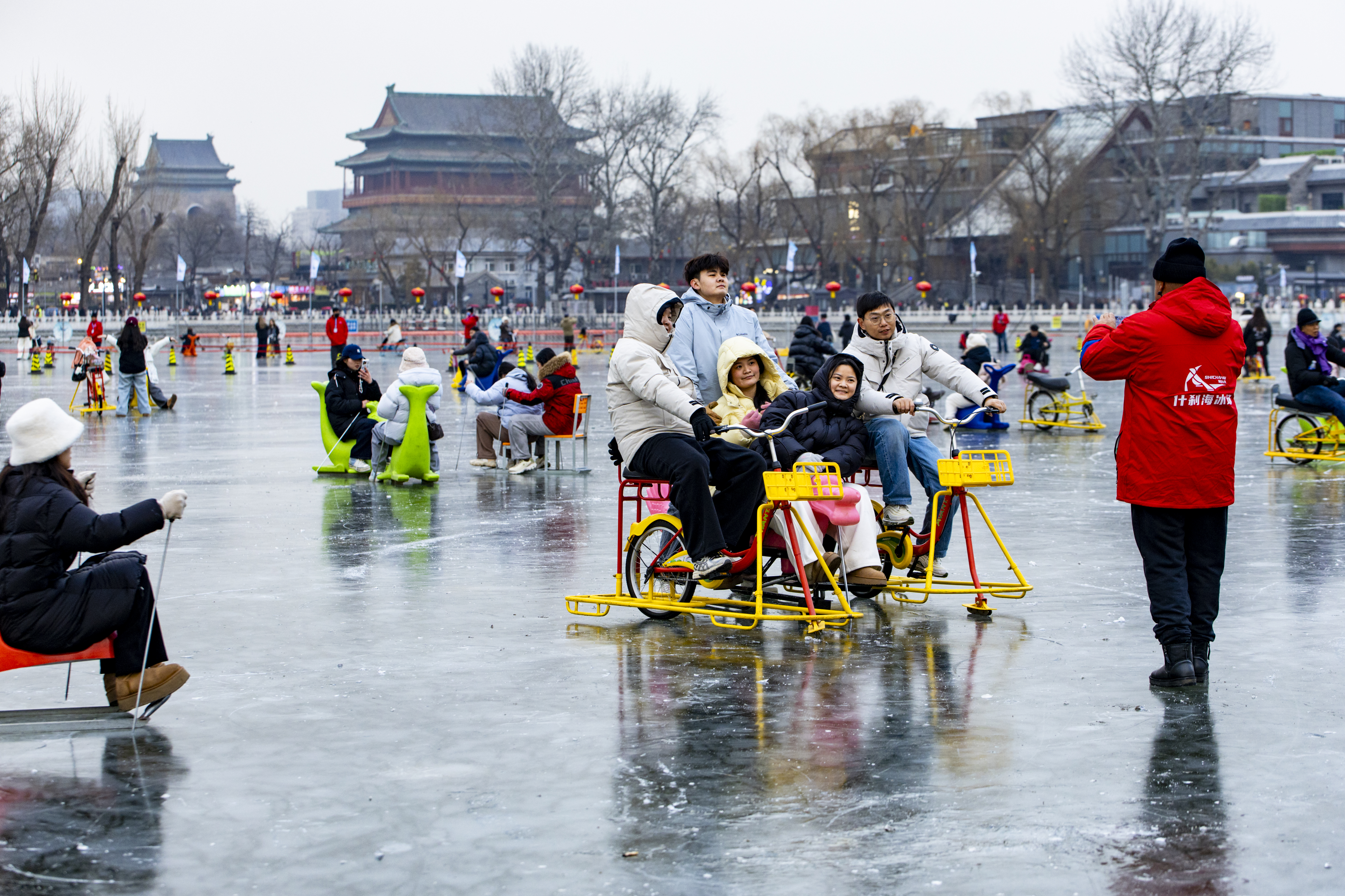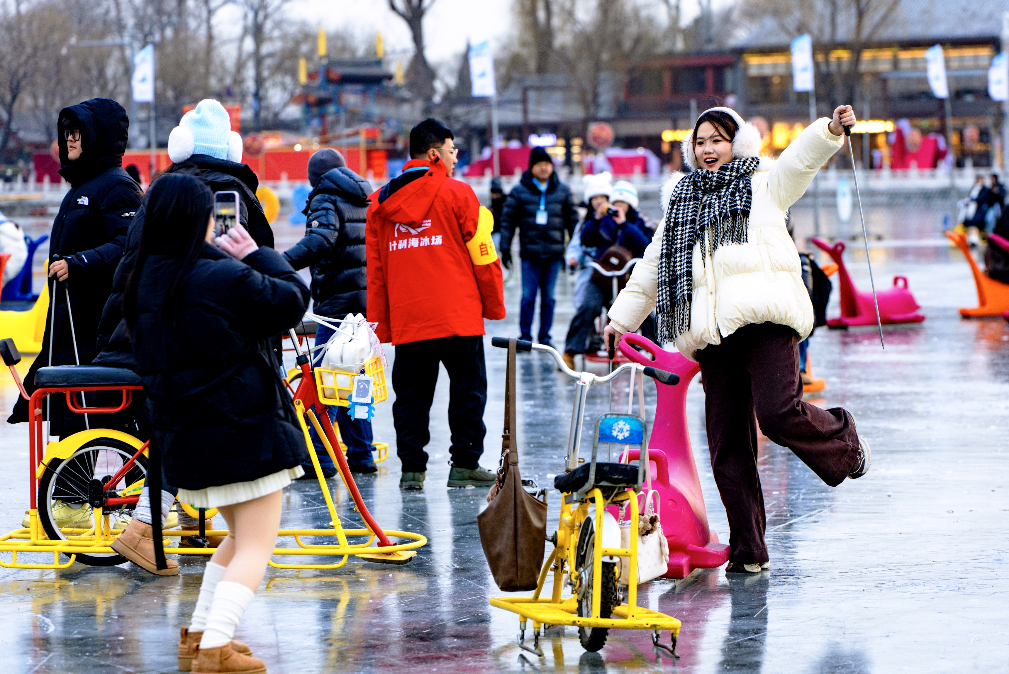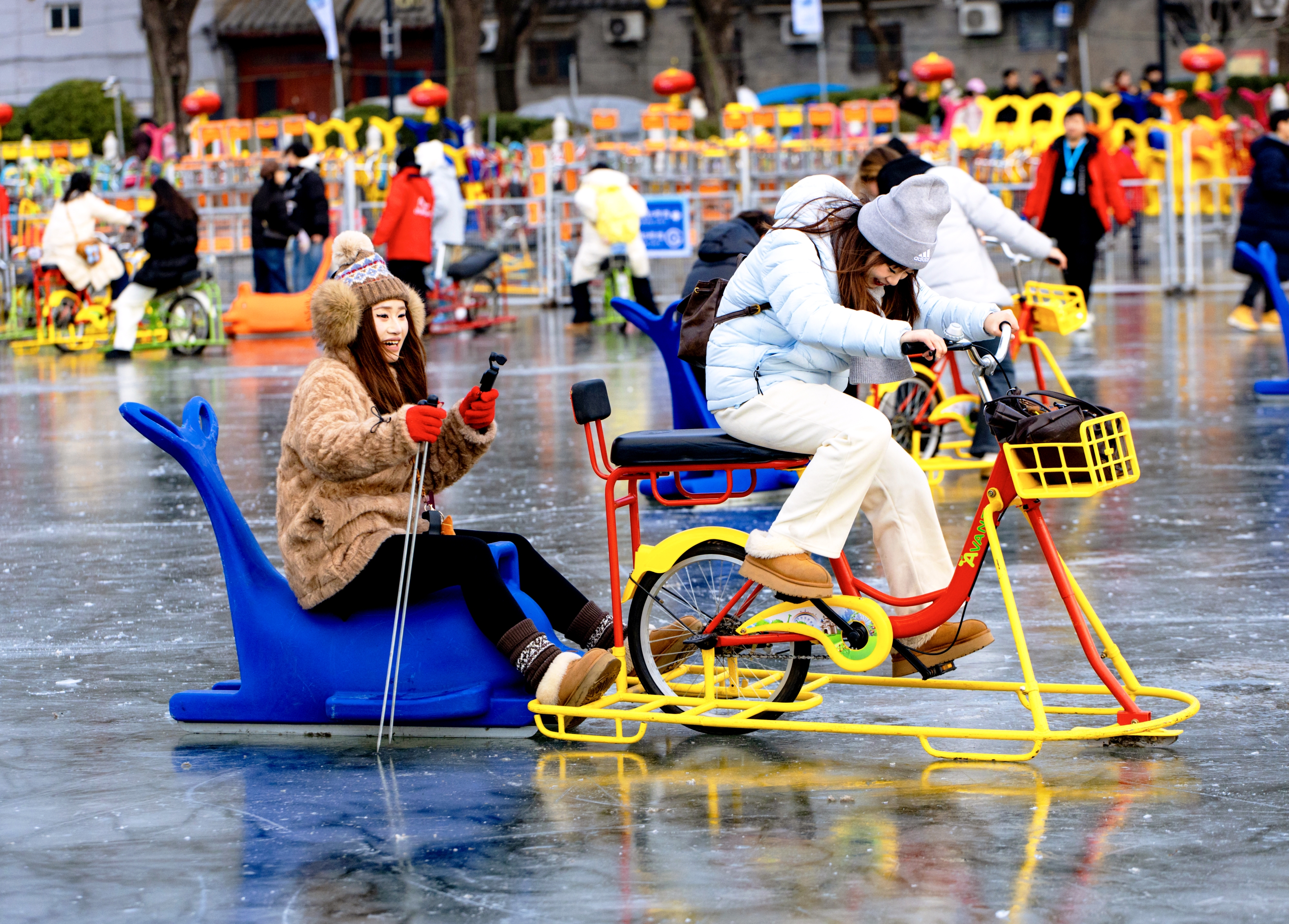 今年什刹海冰雪嘉年华以“飞马踏冰”为主题,冰场入口及围栏处的道旗、灯笼等均巧妙融入马年元素,冰面上更设置了灵动的蓝色飞马雕塑,方便游客打卡,随手一拍便可获得与冰面、骏马、鼓楼、蓝天同框的大片。冰场上,单人冰车、双人冰车、冰上自行车等多种设施一应俱全,让游客尽享冰上乐趣。待夜幕初升,更有环湖灯光会璀璨亮起,多彩光效环绕冰面,为您解锁如梦如幻的冰上夜游体验。