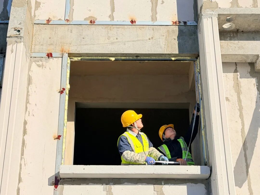 施工人员进行室内窗户测量。