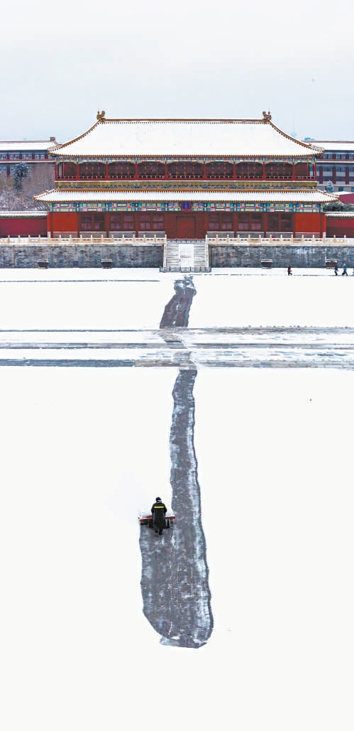 太和殿院内,工作人员在扫雪,像书法家挥毫泼墨。