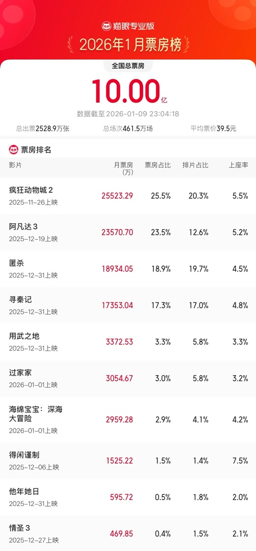 据猫眼专业版数据,1月9日23时04分,2026年1月总票房破10亿,《疯狂动物城2》《阿凡达3》《匿杀》分列1月票房榜前三位。