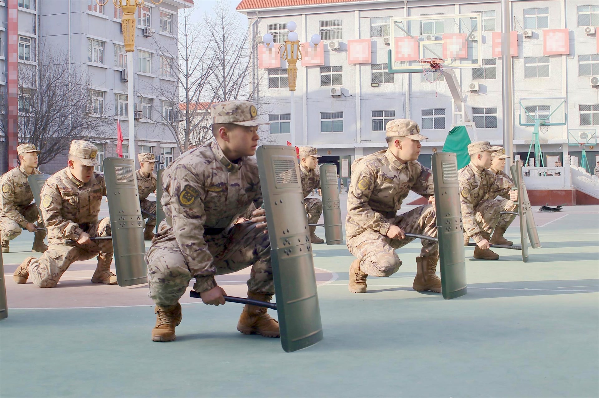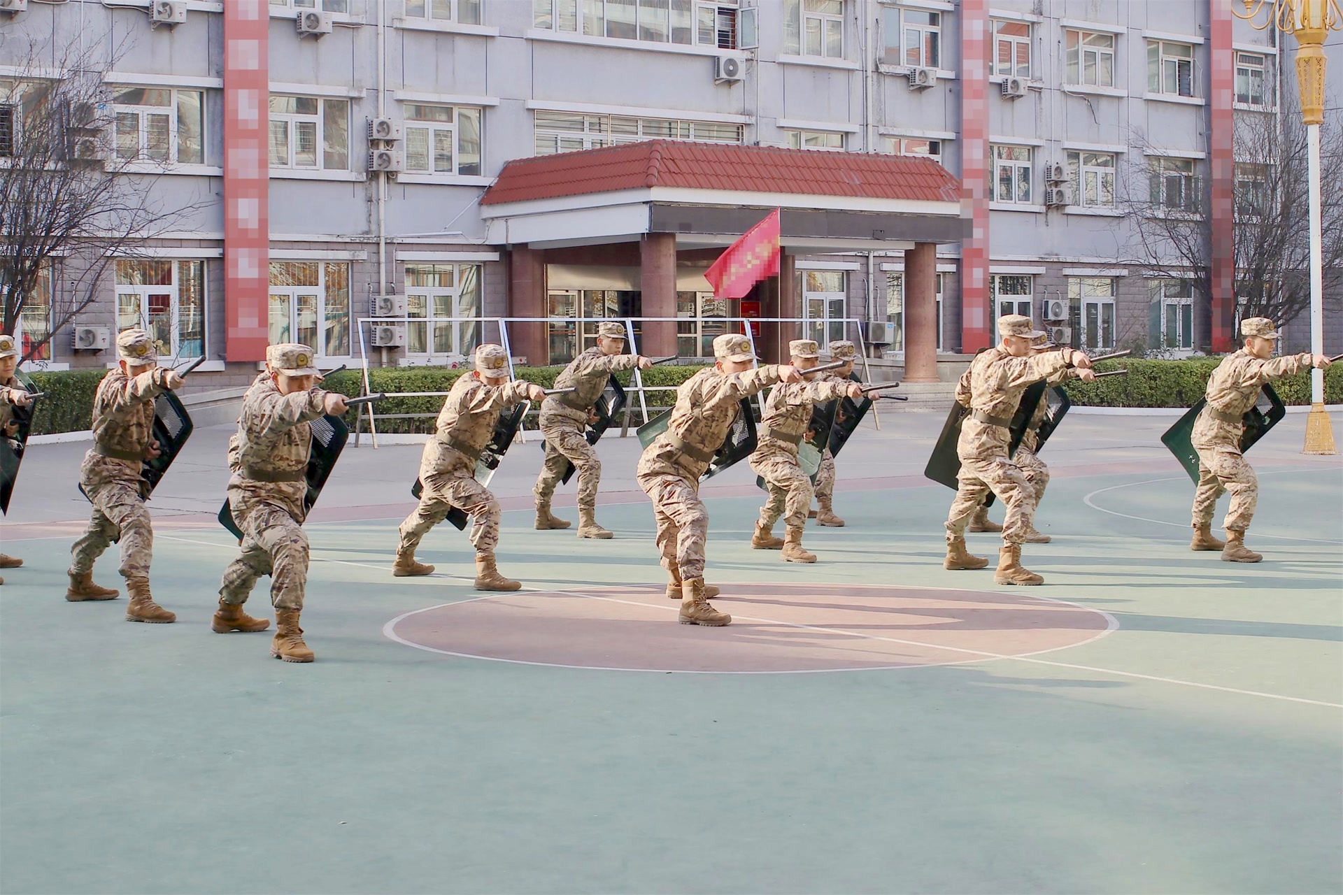 警棍盾牌术训练场,攻防衔接紧凑有序。官兵们手持警棍盾牌,立盾防御、滑步推盾、斜盾防护等动作规范有力,警棍点戳制控、横扫格挡与盾牌防护无缝衔接。