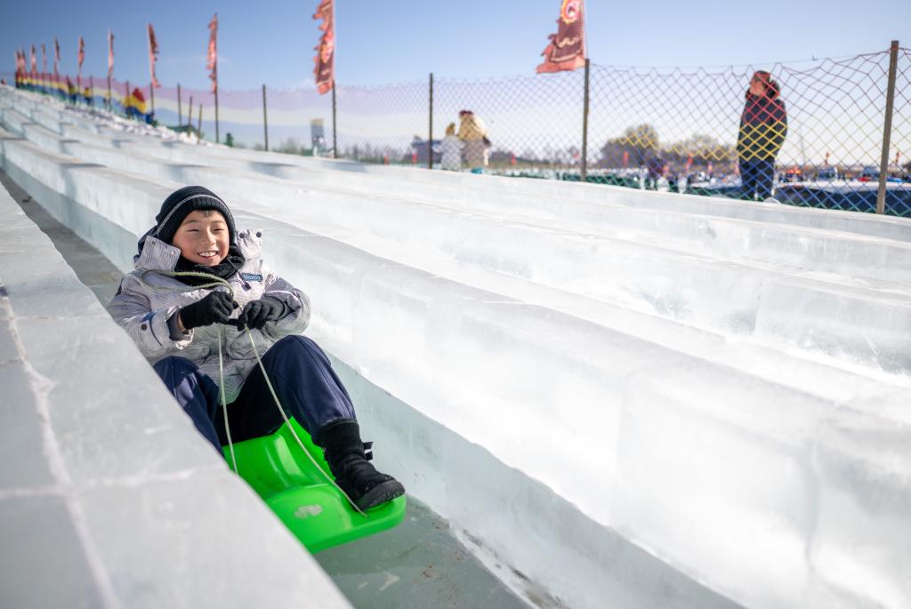 1月10日,一名儿童在玩滑冰梯。新华社记者 连振 摄