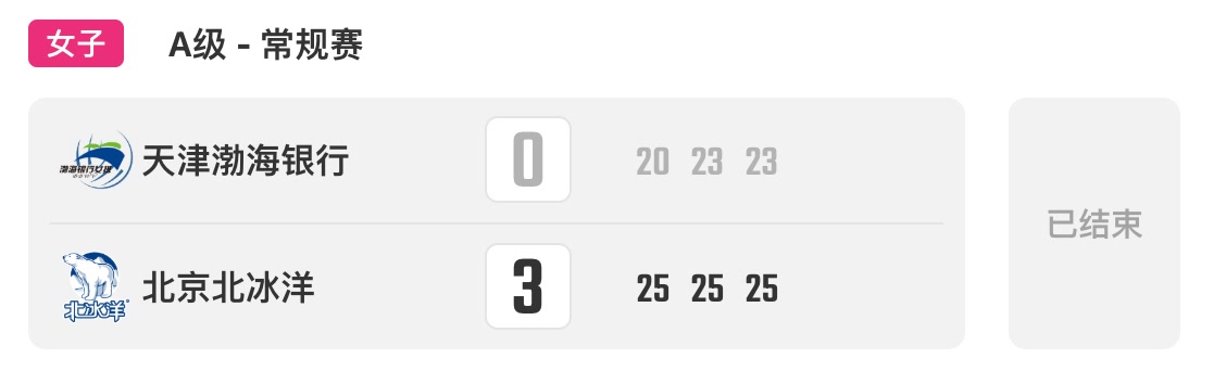 本赛季随着比赛不断深入,邹佳祺逐渐激活了法布里斯的进攻火力。本场第三局,二人配合屡屡撕开对手防线,帮助球队稳住局面。局末,两队再度陷入相持。关键时刻,天津女排进攻连连出现失误,北京女排25比23拿下,从而以3比0获胜。