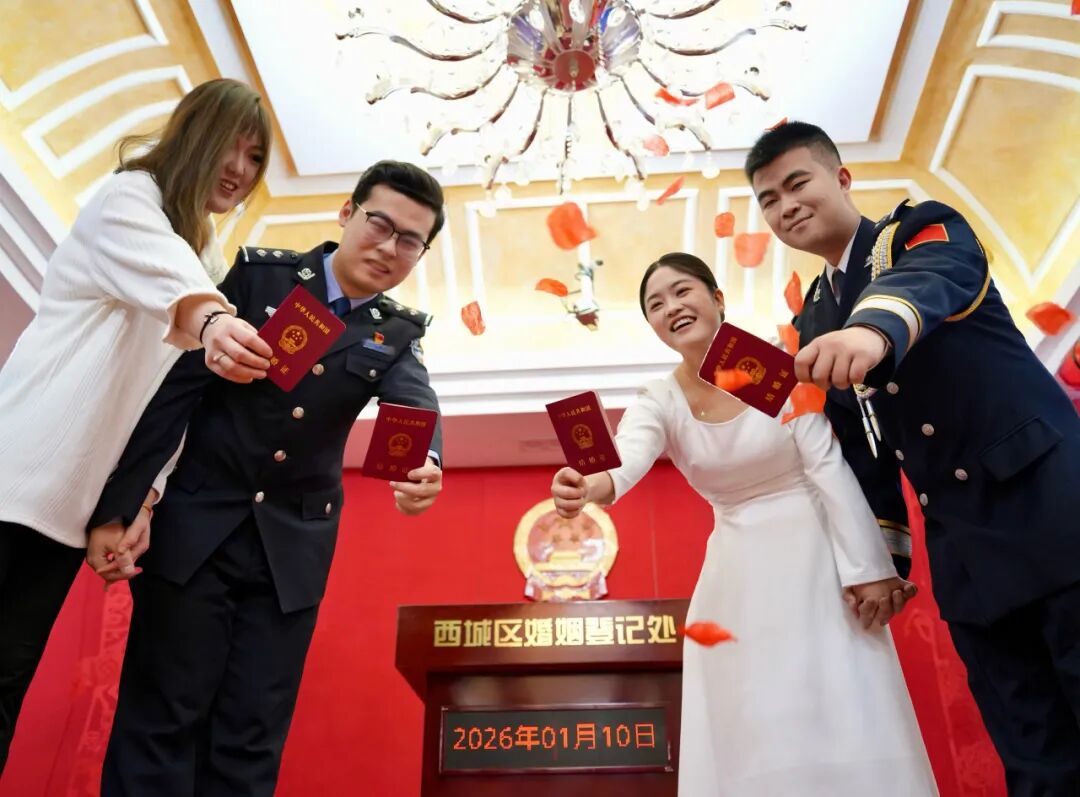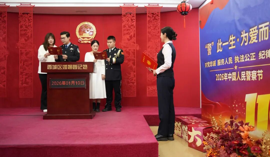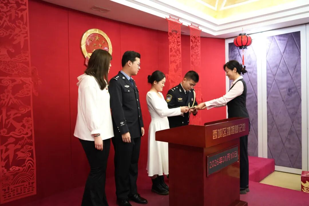2026年1月10日,在第六个中国人民警察节来临之际,西城区民政局联动西城公安分局,为前来办理结婚登记的警察新人提供高效便捷的登记服务,用暖心细节为他们打造难忘的幸福时刻。