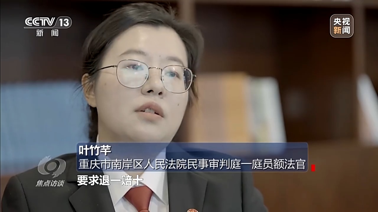 重庆市南岸区人民法院民事审判庭一庭员额法官 叶竹芊:原告认为这个产品,可能在质量上不太符合国家食品安全法的相关规定,原告要求按照食品安全法退一赔十,退一相当于货款9000块钱,赔十是赔偿9万块钱。