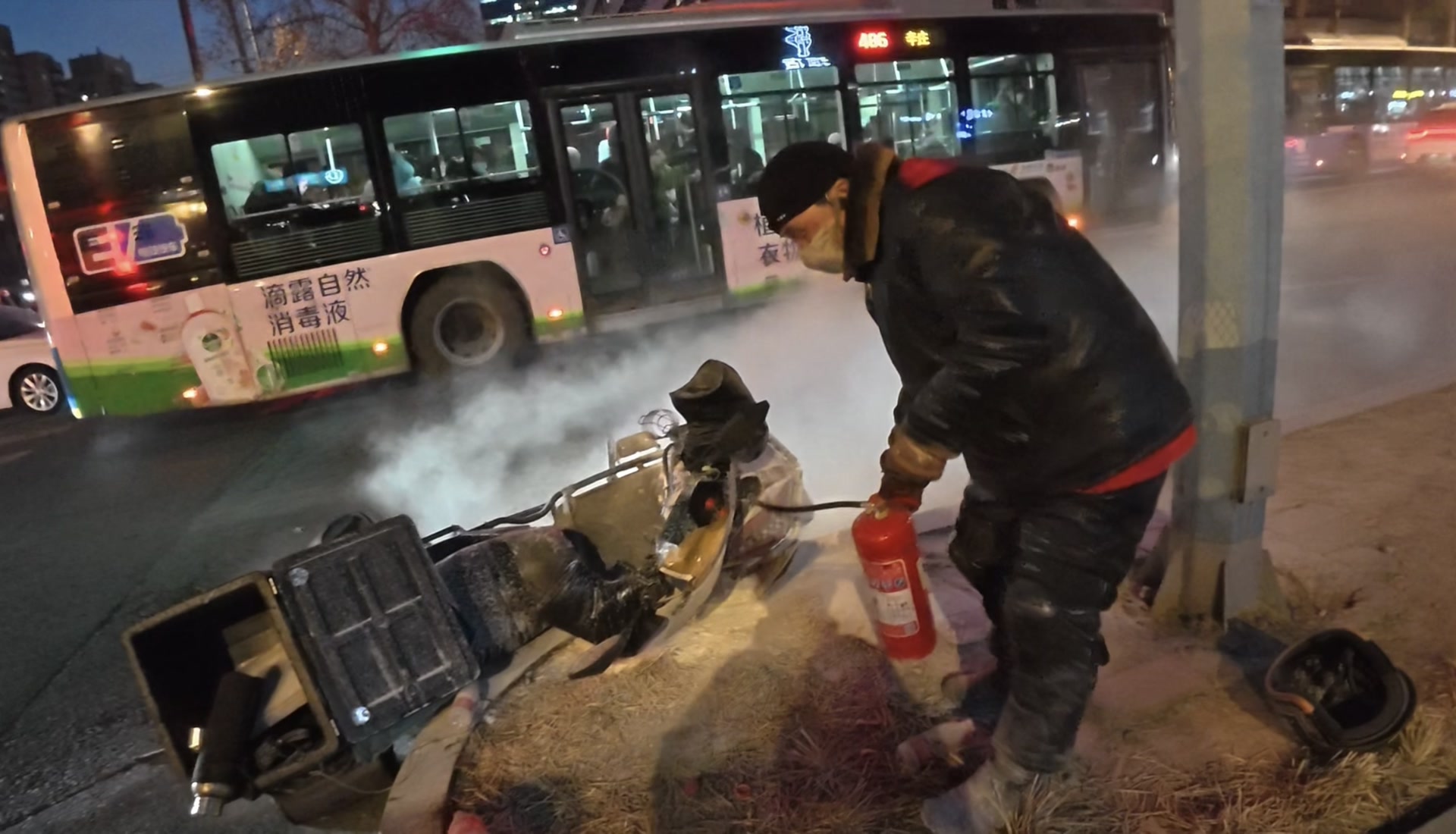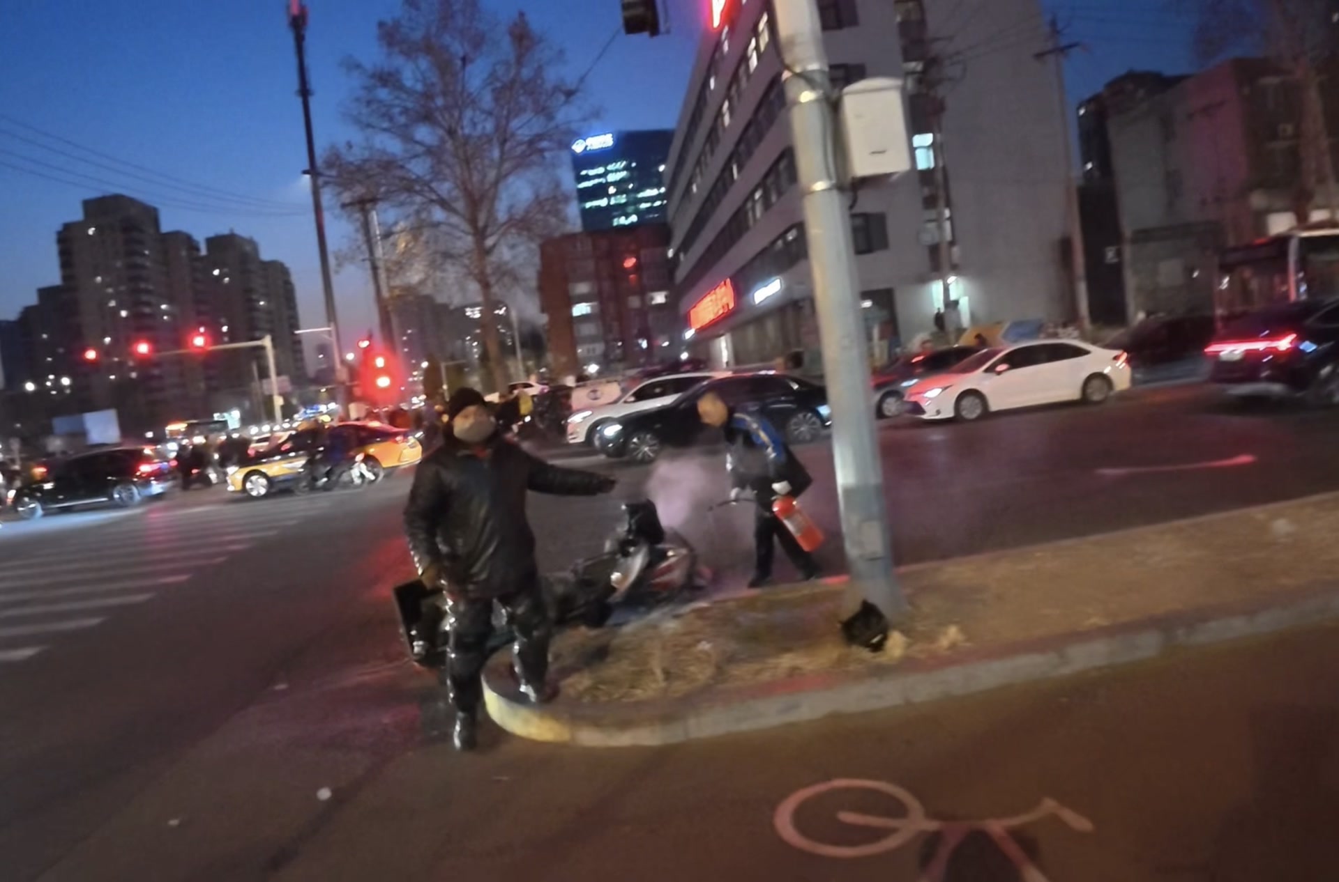 1月8日,十里堡地铁站东北口附近的路口,一辆电动自行车突然起火。周围路过的骑手、公交司机纷纷出手,大家联手完成了一场暖心救援。