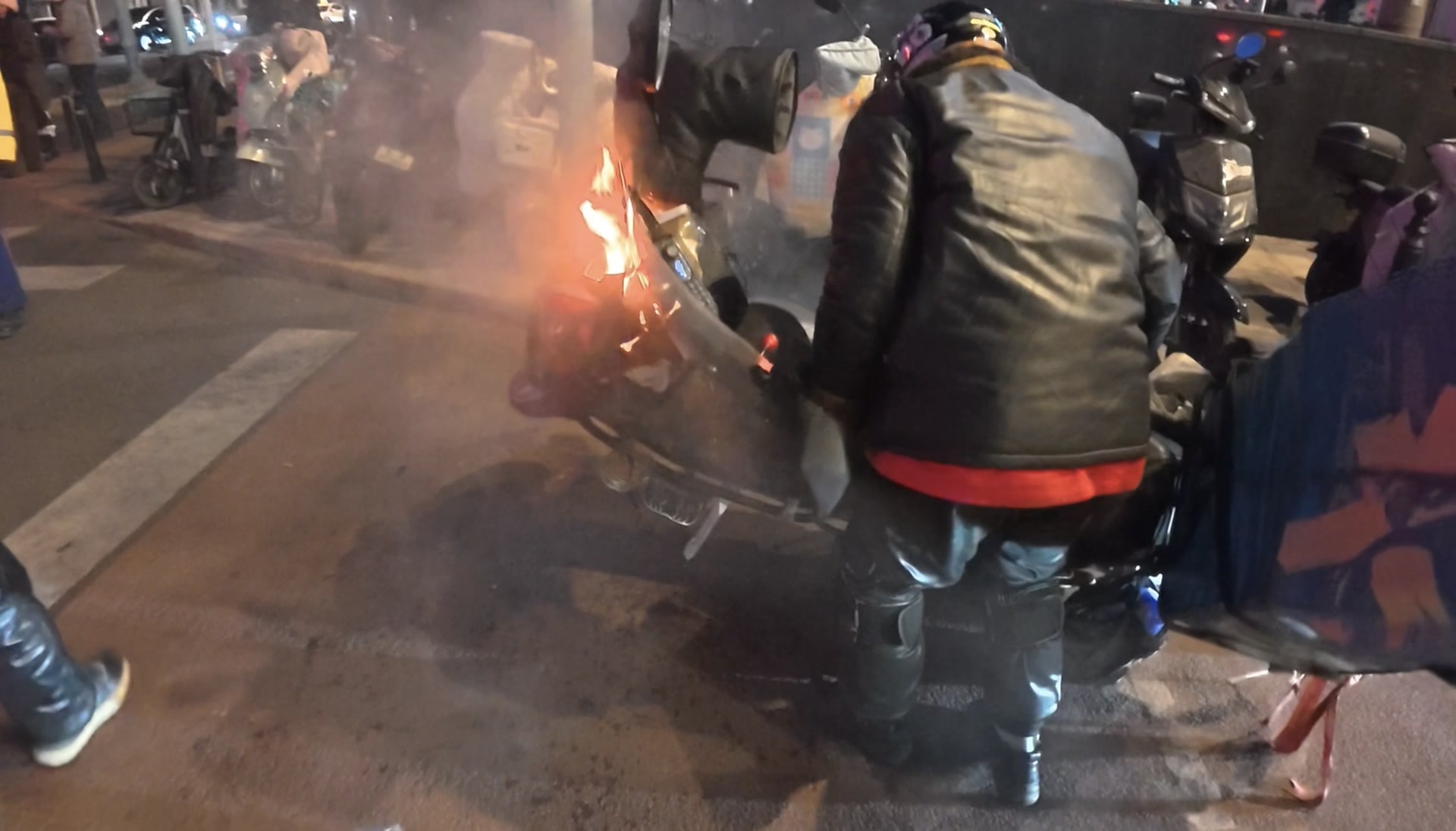 女外卖员郝颖和一位身穿黑色外套的骑手同时停下了车,快步冲向起火车辆。电动自行车的车主是一名送货的骑手,他赶紧断电,把电池和车上的货物搬到路边。郝颖从自己的外卖箱里翻出一瓶水,朝着火苗浇去。可电动自行车是线路起火,水根本起不了作用,火苗很快就从车头蹿了出来。
