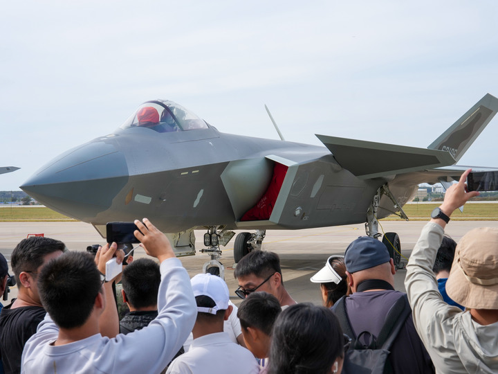 ↑2025年空军航空开放活动和长春航空展上,观众参观歼-20战机。新华社记者 张楠 摄