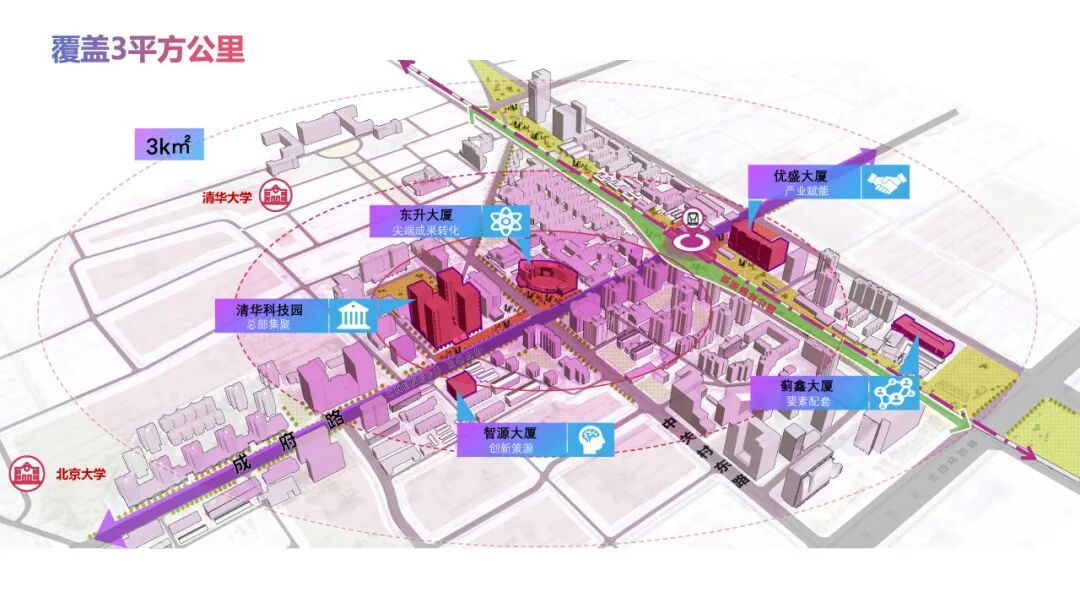 这里不是普通社区,而是一座 “生长在创新土壤上的未来街区”。东至王庄路、展春园西路,西抵中关村大街,北邻清华大学,南达北四环西路,辐射3平方公里创新热土。以东升大厦为圆心,1公里范围内: