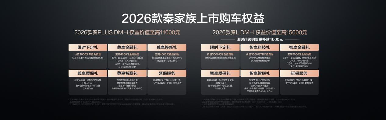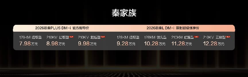 1月8日,比亚迪正式推出2026款秦L DM-i与秦PLUS DM-i双车210公里长续航版本,售价区间为8.98万元至12.28万元。其中,2026款秦L DM-i 210公里长续航版限时超级优享价11.28万元至12.28万元;2026款秦PLUS DM-i 210公里长续航版售价8.98万元至9.98万元,并同步推出多项上市权益。