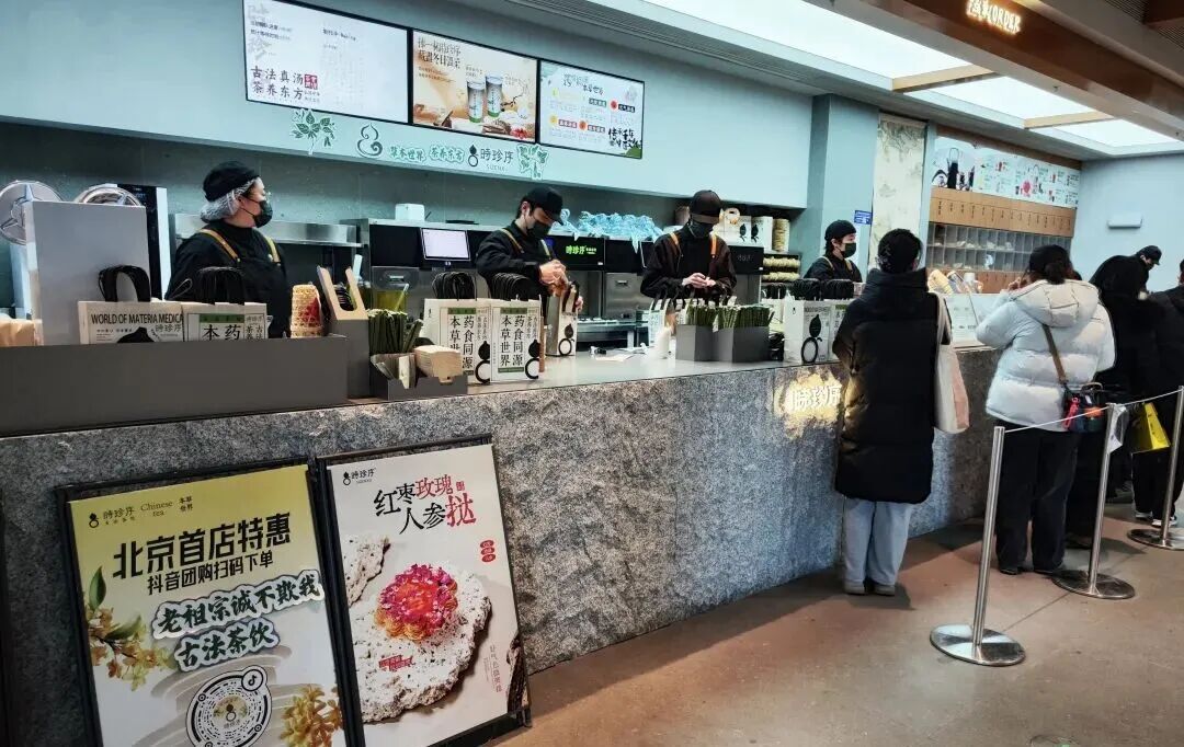 产品创新之外,场景革新与文化赋能让顺时而饮成功打破老字号的地域与年龄限制,实现了从产品到品牌的全面破圈。顺时而饮(前门旗舰店),与天乐园大戏院、便宜坊烤鸭店等百年老店为邻,与长春堂老药铺始创店仅隔一条马路,地理位置得天独厚。门店集零售产品、手作草本饮与人文茶座于一体,成为游客感受京味文化、体验新式养生的重要站点。“驴打滚牛乳茶很有老北京特色,味道很新颖,适合我们年轻人,二十四节气养生茶打算带回去给家里老人尝尝。”专程前来打卡的外地游客王女士说。