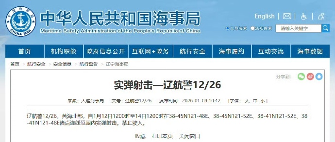 据中国海事局网站消息,大连海事局发布航行警告,1月12日12时至14日12时,黄海北部部分海域实弹射击,禁止驶入。