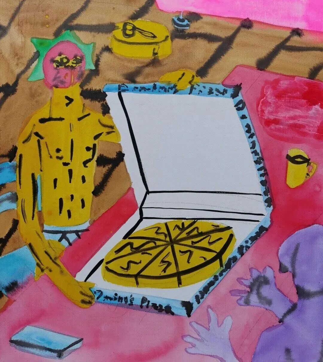 他创造出来的“月饼人”系列,更是妙趣横生:在作品《蜻蜓人和裸裸》中,“月饼人”可以变成“蜻蜓人”,面部形象灵感来源于作者经过长途旅行暴晒后的脸和眼圈,而这些动作是对生活中去达美乐买披萨的记忆“截屏”。观察生活、体验生活、记录生活,让观众感受到真实的生活质感。